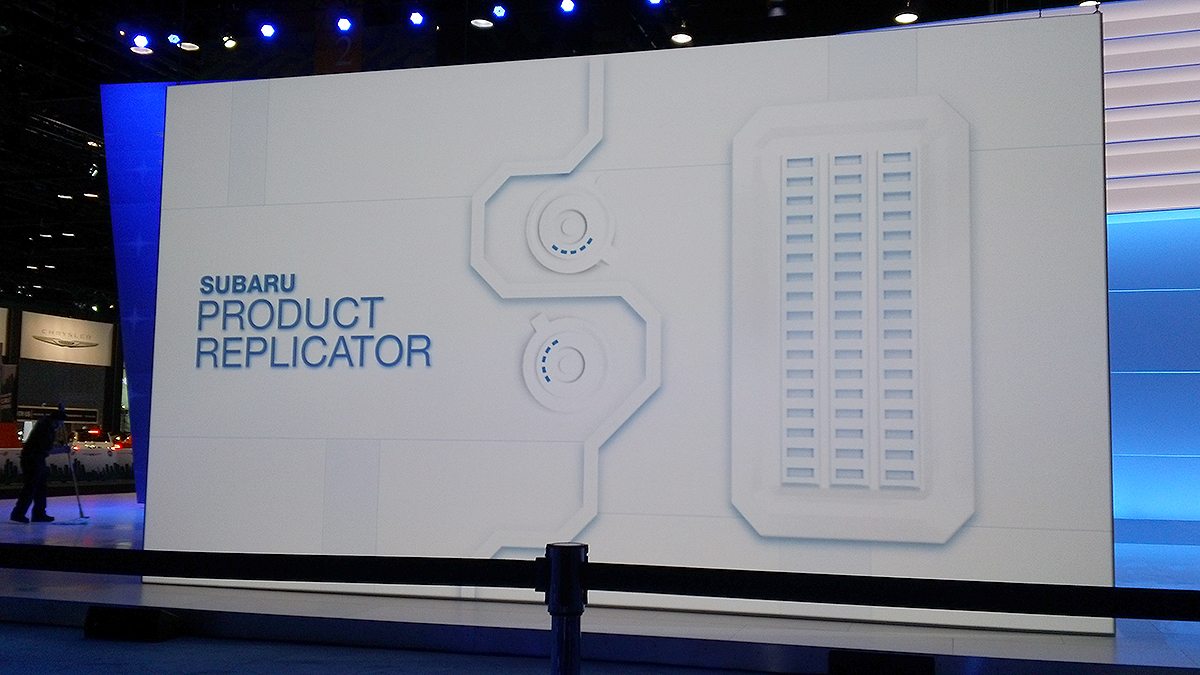 After that, it was Subaru’s turn to amaze us — and that they did. Their expansive but conservative stand had a single element monopolizing it; The Product Replicator. In one of the best reveals I have ever seen, Michael McHale (Subaru Director of Corporate Communications) would give remarks and suddenly the Replicator would produce a 2D image of a new car being carved from nothing. The end result would be an image of the new car on the screen, the screen lifting and behind it was the all new Subaru Legacy. An amazing presentation befitting 25 years of the Legacy’s existence.