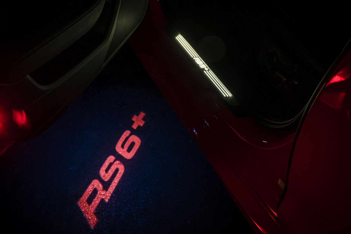 As passengers enter the ABT Sportsline RS6+ at night, they’re greeted by a new LED light projecting the ‘RS6+’ logo on the ground beneath the doors. Inside ABT Sportsline will upholster the interior in custom leather as well as carbon fiber trim pieces. A new leather and carbon fiber steering wheel faces the driver along with an ABT start-stop button and gear knob badge. A special model number badge displaying the build number out of 50 is a centerpiece of the cockpit. Soft RS6+ embroidered floor mats and truck mat give the super wagon that extra touch of high-end comfort.