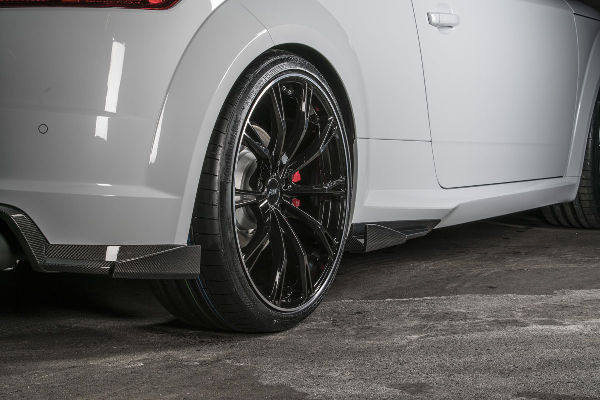 Visually, the ABT TT RS-R is enticing and mouth-watering for those that desire some track time thanks to carbon aero. A focused fascia comes from a new spoiler, flics, blades, and an exclusive front grille frame with red TT RS-R logo. New side skirts run towards the rear where two blade flare upwards and outwards to move air away from the rear wheels. At the rear a new skirt with red TT RS-R logo frames the quad exhaust tailpipes and matches the large factory spoiler above.