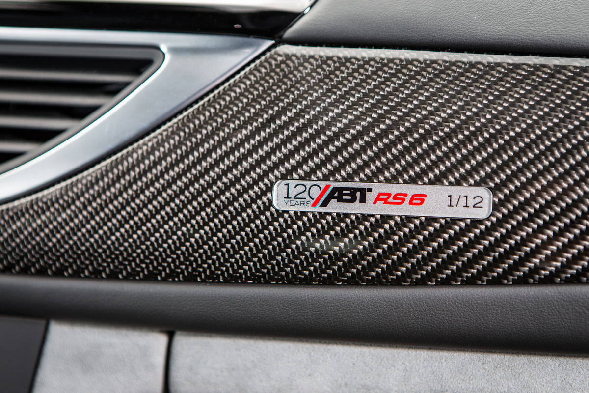 The celebration continues inside for the ABT Sportsline RS6 1 of 12. Here, the floor mats bear a “120 yeas” graphic while a special “1/12” plaque is on display across the dashboard. Even the entrance lights shine a special “120 years” graphic when the doors are opened. Alcantara is worn by the headliner, tailgate, pillars, dashboard and is mixed in with leather on the sport bucket seats in combination with the leather steering wheel, door panels, center console, window frames, and dashboard for a high-end, sporty atmosphere. The first – and final – touch to the cabin is an ABT start-stop switch cap.