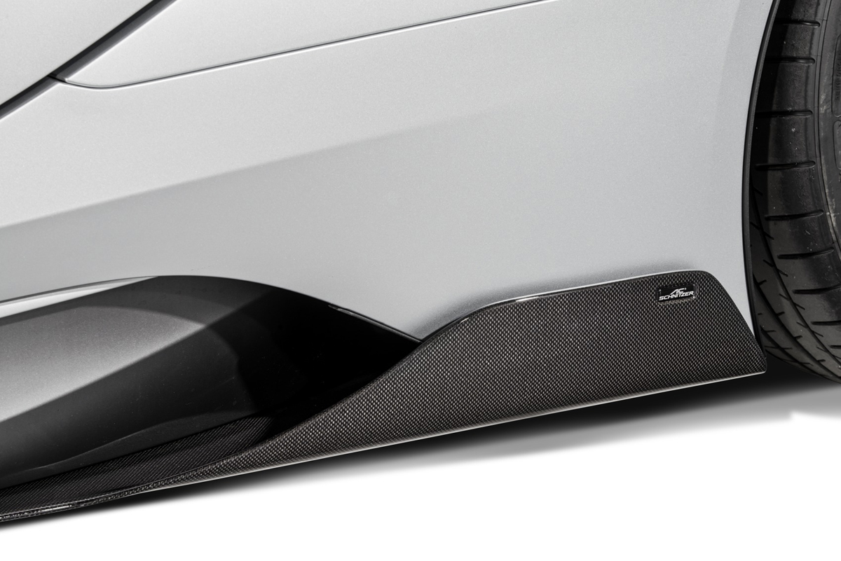 The AC Schnitzer BMW i8 gains a new carbon fiber front spoiler that reduces lift and curves upwards as it extends towards both side of the bumper. The spoiler blends in with the new set of carbon fiber side skirts that create a plane prior to the rear wheels and curves upwards to help channel cool air to the braking system. At the rear, a new carbon fiber spoiler wing generates downforce and emphasizes the smooth teardrop profile of the German sports car for an even more seductive shape.