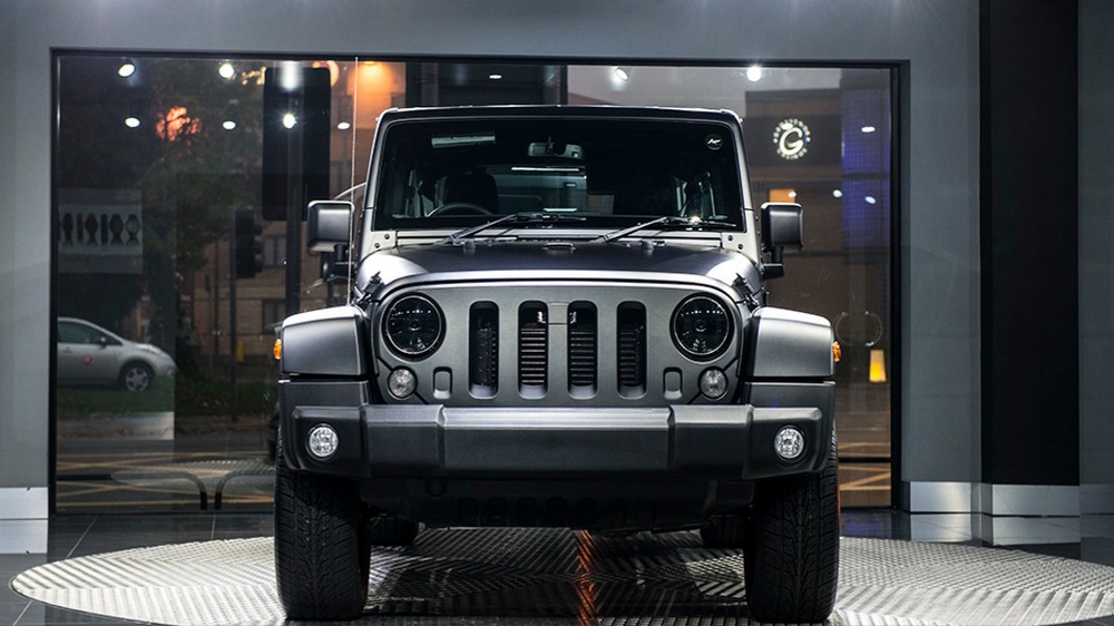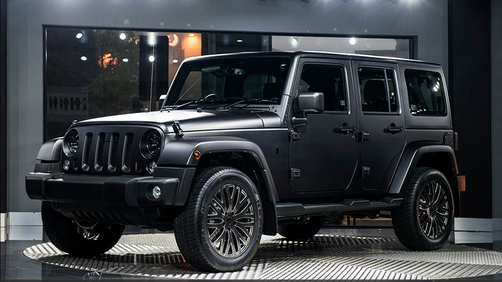 A special Volcanic Rock paint with a smooth finish emits a more confident, high-end custom style for the Chelsea Truck Company Jeep Wrangler CJ300 LE. Satin black adorns the door handles, mirrors, roof, and fuel filler cap to provide a bit of contrast to the unique paint color. Darker shadow chrome headlights stare ahead and flank the new four-slot Chelsea Truck Company grille and its industrial mesh. If observes need more evidence of the SUV’s custom-tailored nature, there’s a new set of fender shields, tailgate logo, and Chelsea Truck Company spare wheel cover on display. As an option, customers can give their Jeep Wrangler CJ300 LE a new quad, cross-hair exhaust system that protrudes from beneath the rear bumper.