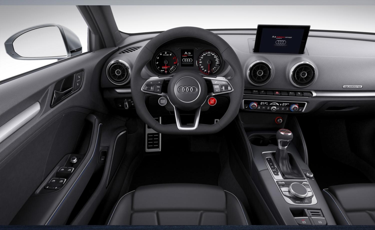 Inside, the Audi A3 Clubsport Quattro Concept features a sporty, black cabin. A total of four passengers can enjoy the turbo-five performance of the concept with the front two being held in place by racing seats with high bolsters, integrated head restraints, and CFRP shells at the back. Light grey piping and Sepang Blue provide some contrast to the dominant black color along with brushed aluminum inserts instrument cluster badge, and door sill nameplates. Facing the driver is a three-spoke multifunction steering wheel with two large stop and start buttons while an instrument cluster with black faces, red indicators, and white numbering with integrated shift light easily displays information. Black alcantara headliner and pillars while new stainless steel foot pedals, foot rests, and door openers add a bit of contrast.