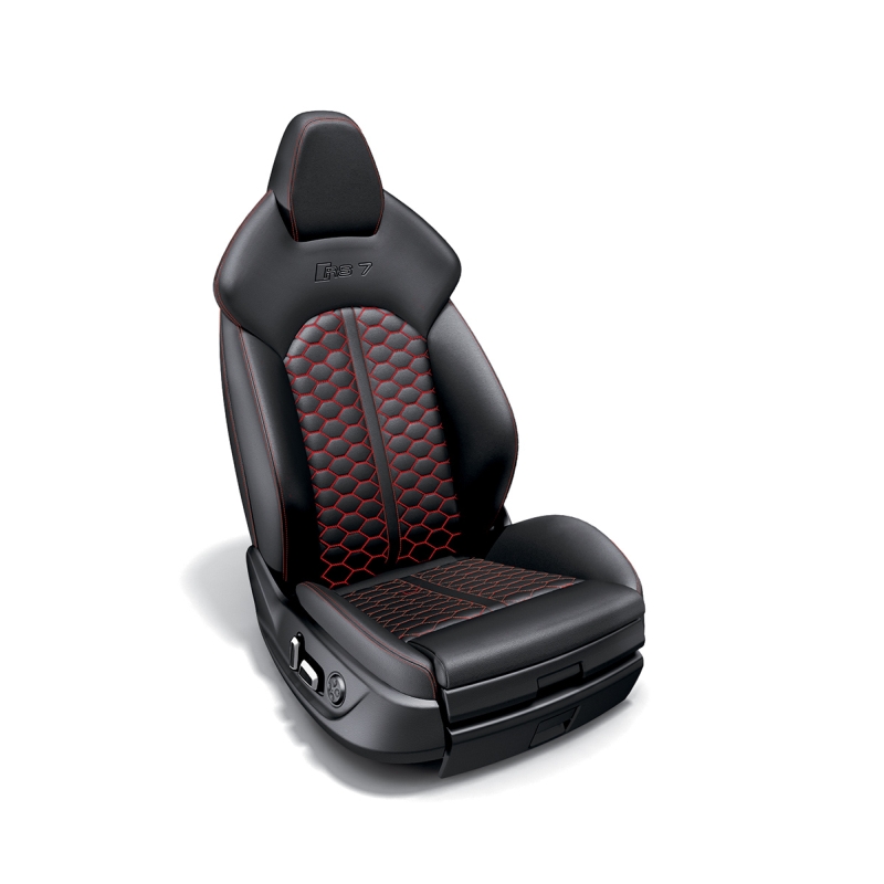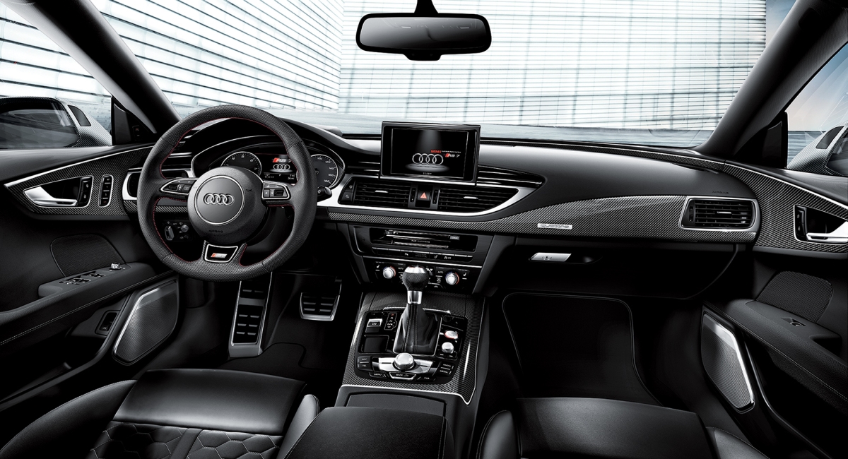 Inside, things take a more dramatic or in this case, dynamic, turn. The Audi Exclusive RS 7 Dynamic Edition wears Black Valcona leather seats with contrasting Crimson Red RS hondeycomb stitching and seat belts. The same vibrant red stitching is also featured on the arm rests, center console, dashboard, and gear shifter boot while carbon fiber inlays make their presence felt around the cabin for a more athletic feel.