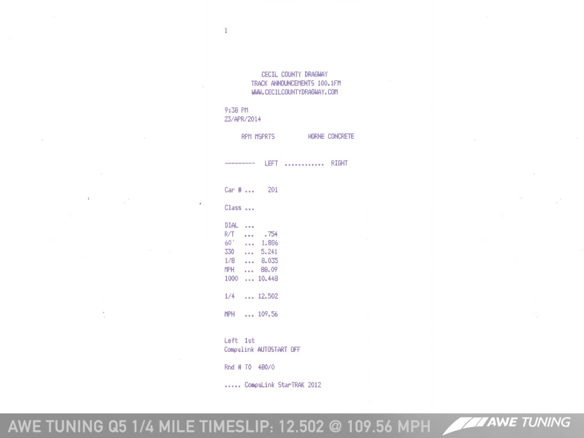 With the added punch, the AWE Tuning Audi Q5 3.0T lined up at the drag strip and threw down a 12.502-second quarter mile run at 109.52 mph on 93-octane fuel. Now, that may not sound earth-shattering when there are all sorts of muscle cars and supercars that laugh at that figure, but for an everyday family crossover, it’s an impressive feat.