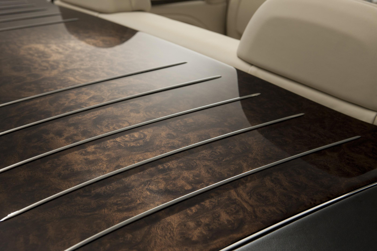 One of the most awe-inspiring aspects of the Bentley Grand Convertible is the rear tonneau. The tonneau features rich, mirror-finished, dark-stained Burr Walnut that has been book-matched and framed in polished chrome. The feature is the largest piece of wood veneer ever applied to a Bentley vehicle and has been fashioned entirely by hand.