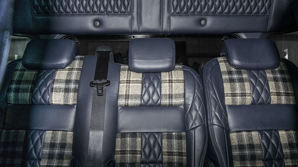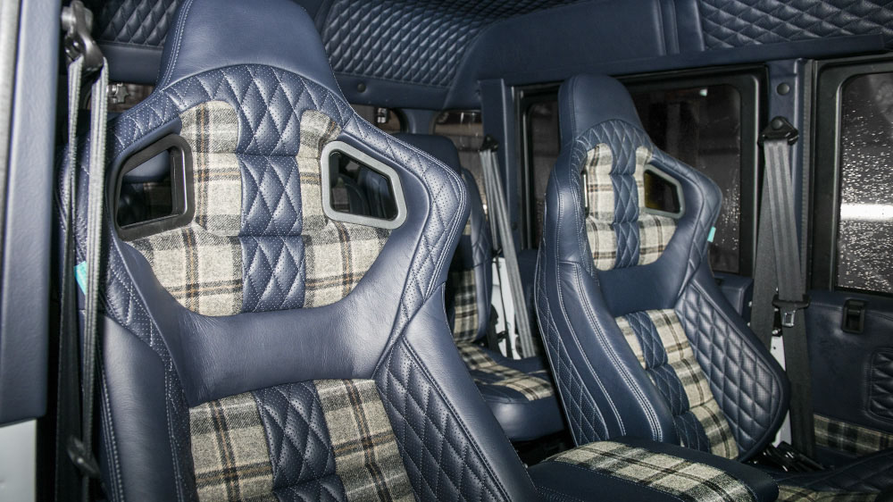 The brawny exterior of the Chelsea Truck Company Land Rover Defender Big Foot is contrasted with a rich and supple custom-tailored interior. Sitting behind the dark-tinted privacy glass are front racing seats and rear seats upholstered in soft Russian Blue leather with Harris Tweed inserts. The same upholstery design has also been given to the front and rear door cards, center console, and roof lining. A three-spoke Billet Aluminum and Black leather steering wheel faces the driver along with a Churchill time clock fascia. Elsewhere, there are new hard-wearing front and rear floor mats, vented foot pedals in machined aluminum, door entry sill plates, and rear cab checker plating.
