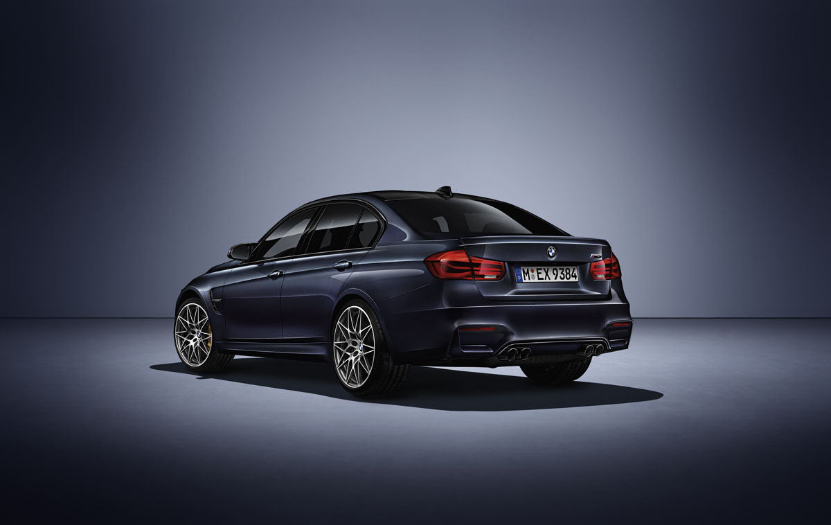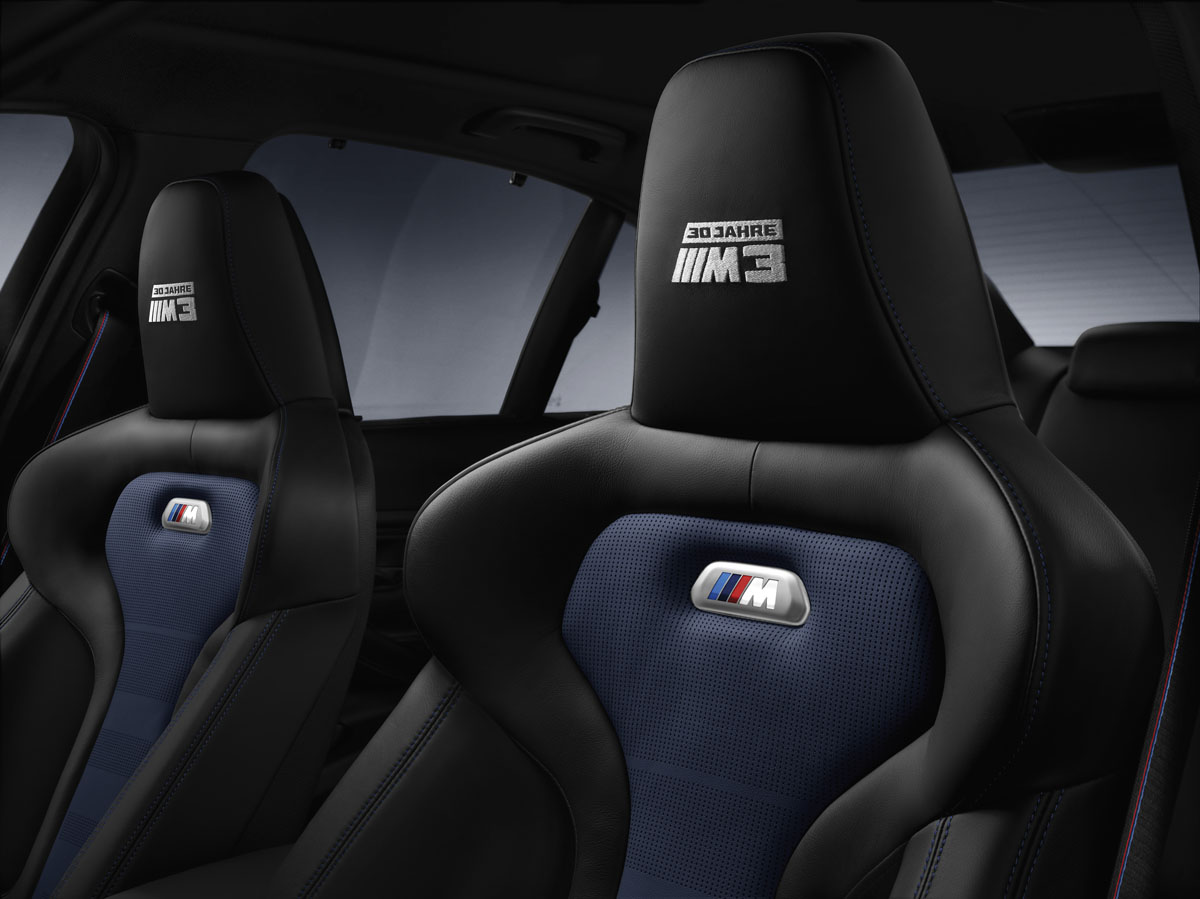 The 150 “30 Jahre M3” models will be available in a unique Macao Blue metallic paint that was worn by the first-generation Sport Evo BMW M3. Other exclusive styling cues are worn throughout the exterior including the BMW Individual High-Gloss Shadow Line on the front grille rear M3 badging, and black chrome tailpipes. Inside, the BMW Individual Merino Leather interior in Black and Fjord Blue is featured with “30 Jahre M3” logos throughout from the door sills to the embroidered headrests. New BMW M sport seats with woven striping, Black Chrome accents, and carbon fiber trim finishers are also standard.