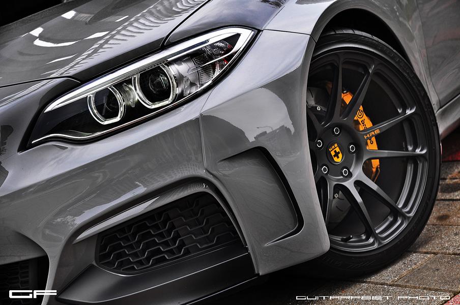 The dynamic nature of the BMW M235i gets even better below the Manhart Racing body kit. The factory wheels were swapped out for a new set of HRE P44SC alloys measuring 19 inches in diameter with a satin black finish. Behind those wheels sit a Brembo GT brake kit with bright yellow calipers and slotted discs for dynamite stopping power. To complete the fitment, a new KW Variant 3 adjustable suspension was added on that allows the HRE wheels to sit snug beneath the monster Manhart Racing fenders.