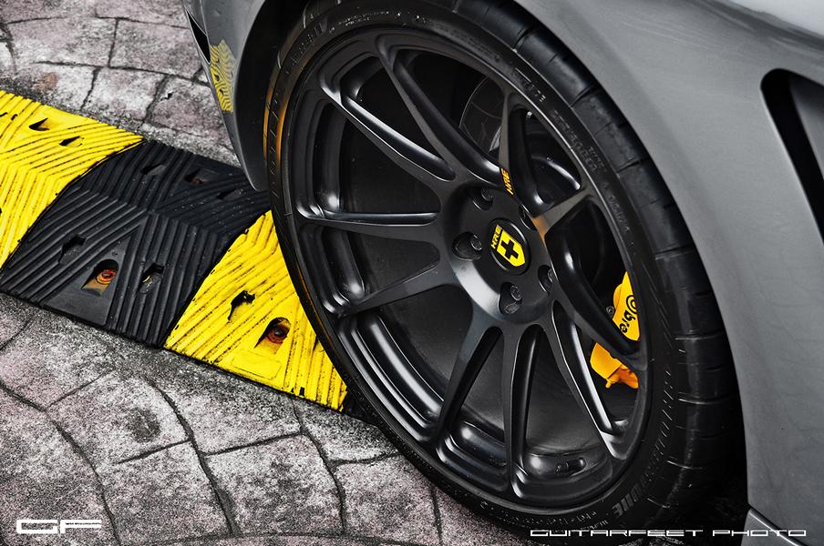 The dynamic nature of the BMW M235i gets even better below the Manhart Racing body kit. The factory wheels were swapped out for a new set of HRE P44SC alloys measuring 19 inches in diameter with a satin black finish. Behind those wheels sit a Brembo GT brake kit with bright yellow calipers and slotted discs for dynamite stopping power. To complete the fitment, a new KW Variant 3 adjustable suspension was added on that allows the HRE wheels to sit snug beneath the monster Manhart Racing fenders.