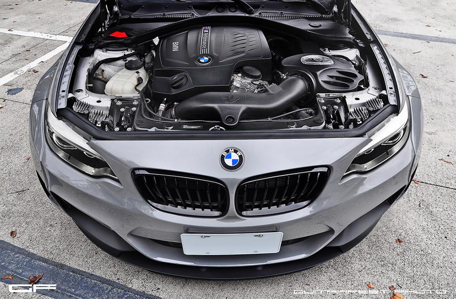 Right off the bat, the BMW M235i by M Sport is more dramatic and assertive. Its presence benefits from a new Manhart Racing widebody kit that has a functional form that blends perfectly with the factory design language. Up front, the kit includes a new bumper with spoiler lip and larger air intakes that blend right in with the extended front fenders. The flared fenders with integrated air intakes and outlets sit on both axles and exude confidence and power. At the rear, a new bumper with integrated diffuser sit while a RKP Clubsport carbon fiber spoiler wing sits atop the trunk for some extra downforce. A black kidney grille finishes it all off.