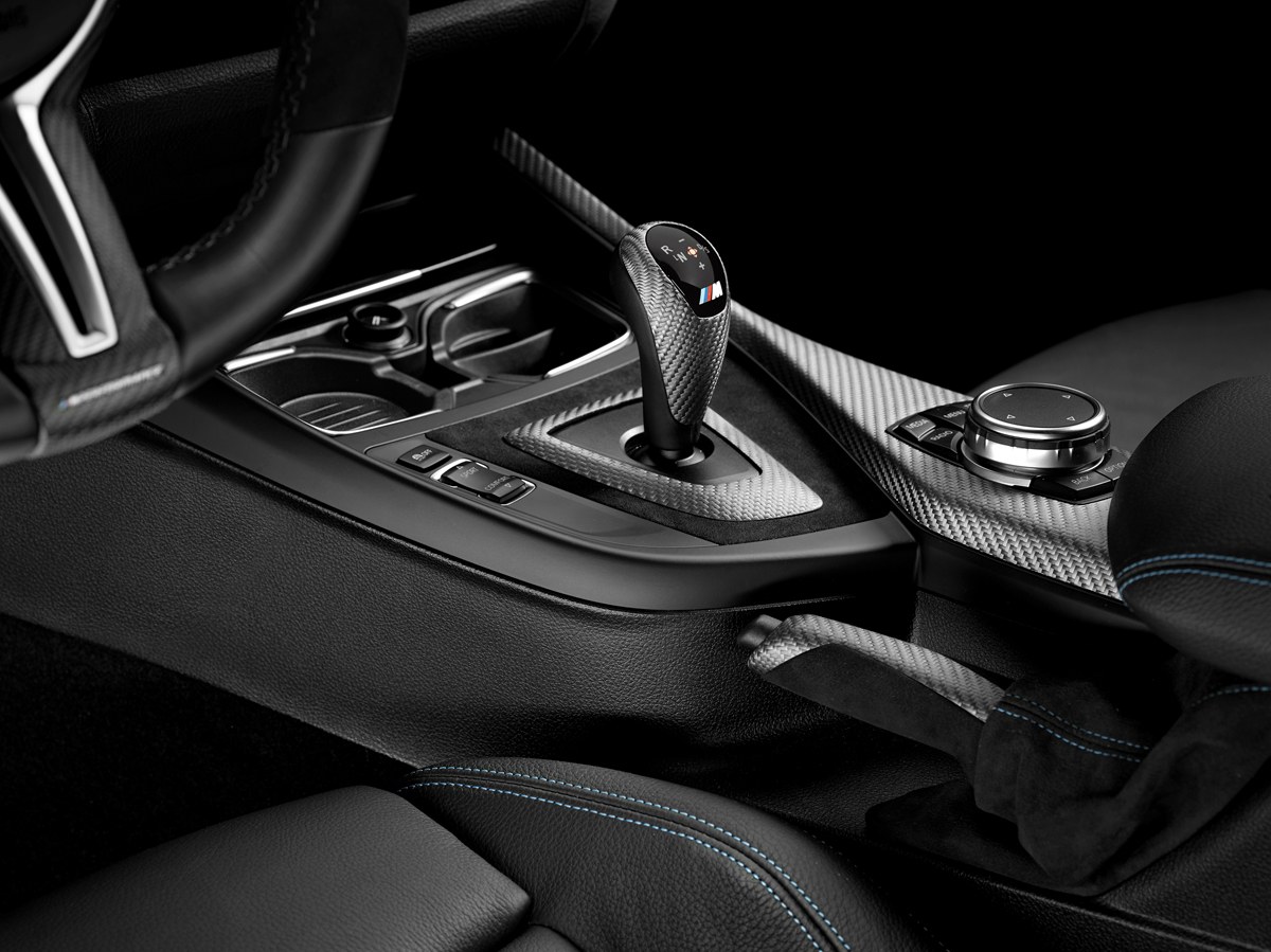 Inside, the BMW M4 has a few motorsport-oriented goodies from the BMW M Performance Parts catalog. The new M Performance steering wheel Pro boasts an Alcantara Anthracite rim with clear-coated carbon fiber and ‘M Performance’ logo. At the top of the rim in the 12-o’clock position is a blue marker similar to that of the brand’s race cars.