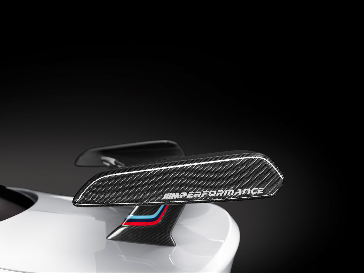 At the rear of the BMW M4 sits a new M Performance through-flow carbon fiber spoiler wing with ‘M Performance’ inscriptions and motorsport striping on the end plates. Below the spoiler sits a motorsport-designed M Performance carbon fiber diffuser with three-bar shape.
