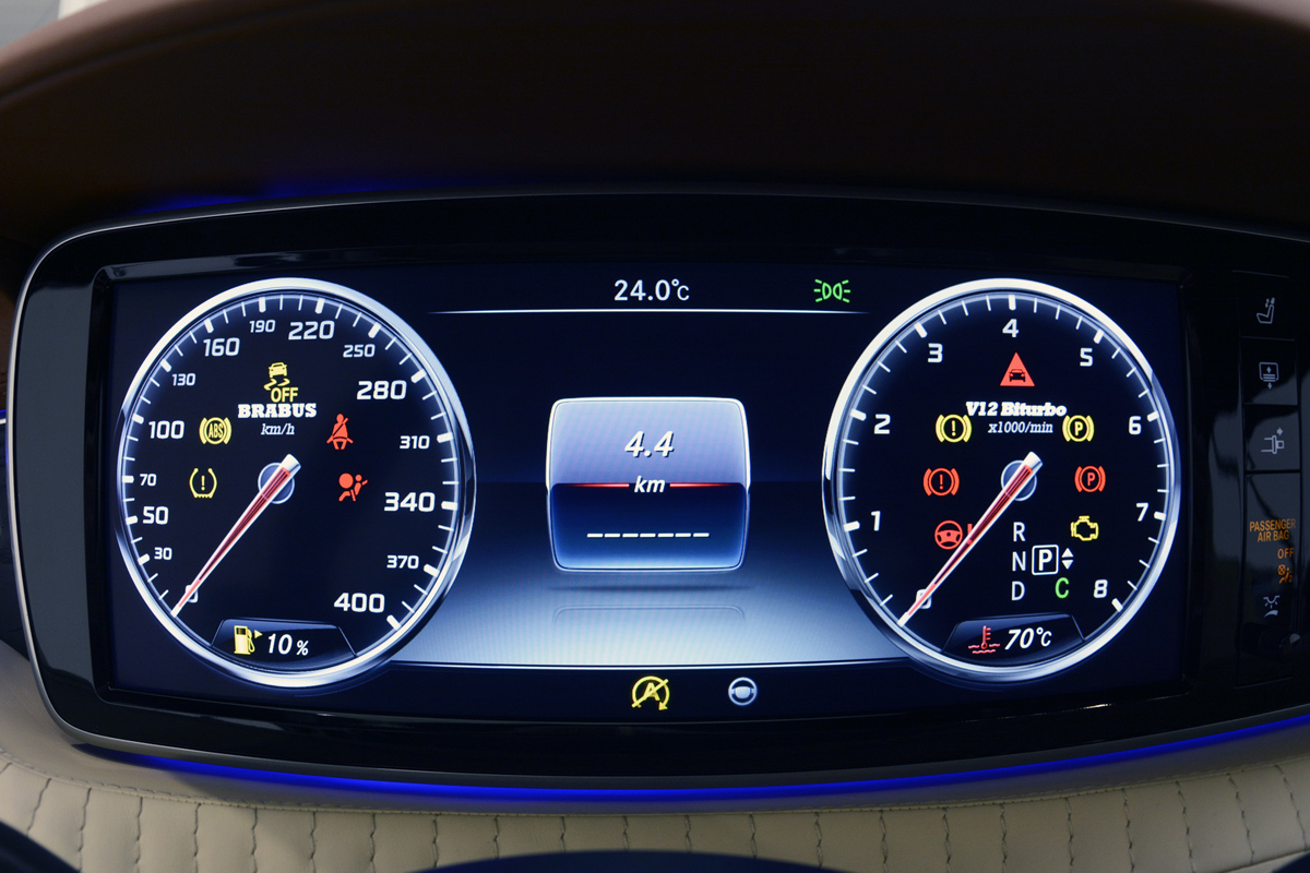After a specially-developed ECU tune, the Brabus Rocket 900 Coupe creates 900 horsepower (887 bhp) at 5,500 RPM and peak torque of 1,106 lb-ft. of torque at 4,200 RPM. For reliability purposes, torque is limited to 884 lb-ft. That allows the heavily modified S65 Coupe to reach 62 mph from rest in 3.7 seconds and 124 mph in 9.1 seconds. Top speed is all the way back at 217 mph, which forced Brabus to add on their 250 mph speedometer inside the gauge cluster.