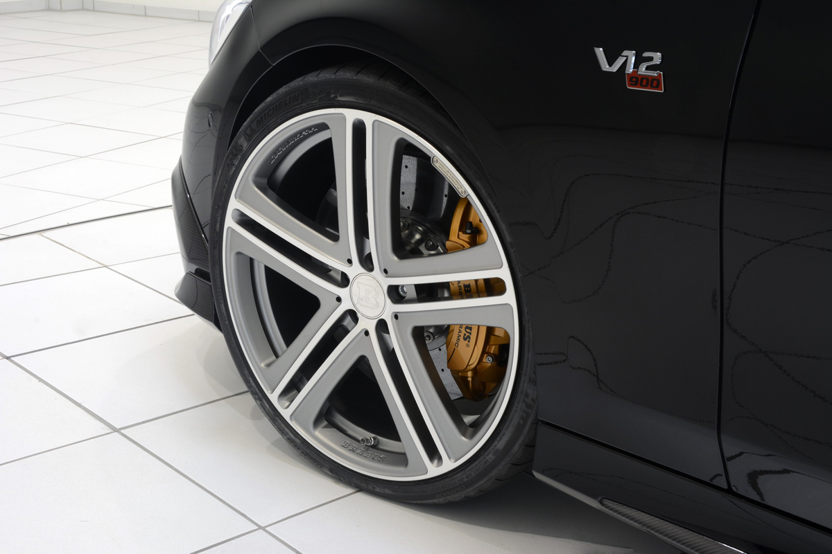 The transformation from Mercedes-AMG S65 Coupe to Brabus Rocket 900 Coupe starts with the twin-turbocharged 6.0-liter V-12 engine under the hood. Here, Brabus engine builders increased the displacement to 6.3 liters (384 cu. In.) by boring out each cylinder and installing corresponding pistons alongside a billet crankshaft with longer stroke and precision-balanced rods. Two larger Brabus turbochargers feed in more boost and work with modified exhaust manifolds. New 80 mm downpipes send exhaust gasses into free-flow metal catalytic converters and to the valve-controlled stainless steel performance exhaust ending in ceramic-coated tips. A new Brabus 900 intake module brings air through the radiator grille into two air boxes. The charge air temperatures are kept low thanks to “Gold Heat Reflection” sheathing for that high-end, high-performance touch.