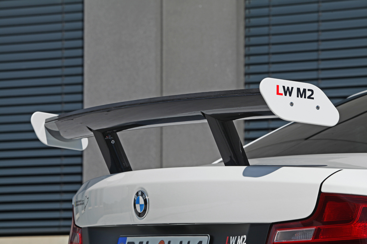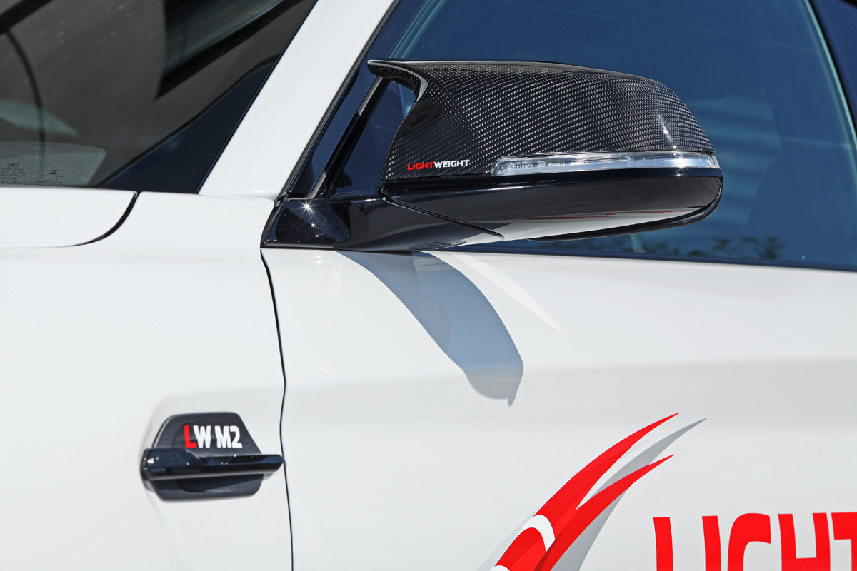 But the real star is the carbon fiber goodies that Lightweight Performance gave their LW M2. A new carbon fiber front spoiler blade, rear wing, and outside mirrors have all been molded after the BMW M4. These components not only add an aggressive tone, but optimize airflow. Lightweight Performance also gave the LW M2 new high-strength black vinyl on the front air intakes and between the taillights on the trunk for a special look.