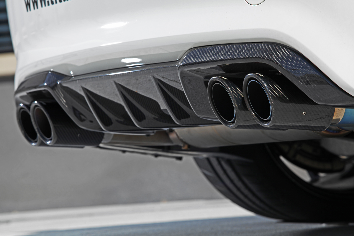 The pounds were also dropped at both axles thanks to new forged wheels and brakes. Here, new LW forged wheels were installed in a 10.0 x 19 setup at the front and rear with sticky 265/30/19 Michelin Pilot Sport Cup 2 tires for loads of grip. New 380 mm front and rear Brembo GT brake discs make stopping even better, especially for those track days. The final touch beneath the bodywork is a new Bilstein Clubsport suspension kit.