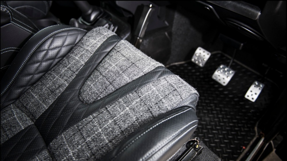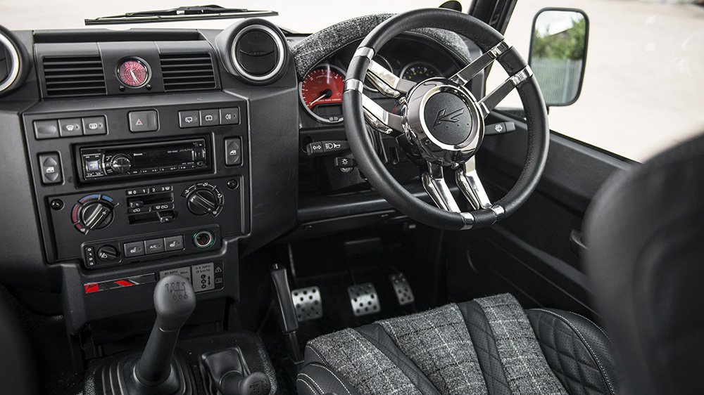 Inside, the ruggedness of the off-roader gives way to a more refined atmosphere thanks to the new Chelsea Truck Company upgrades. All of the seats were replaced with new GTB seats sporting quilted and perforated leather with Harris Tweed inserts. The same upholstery also adorns the center console, passenger dashboard, handles, door panels, instrument binnacle, sun visors, and the headliner of the Defender ‘The End Edition’. A new Kahn billet and leather steering wheel, Churchill clock, and vented and machined aluminum foot pedals complete the transformation.