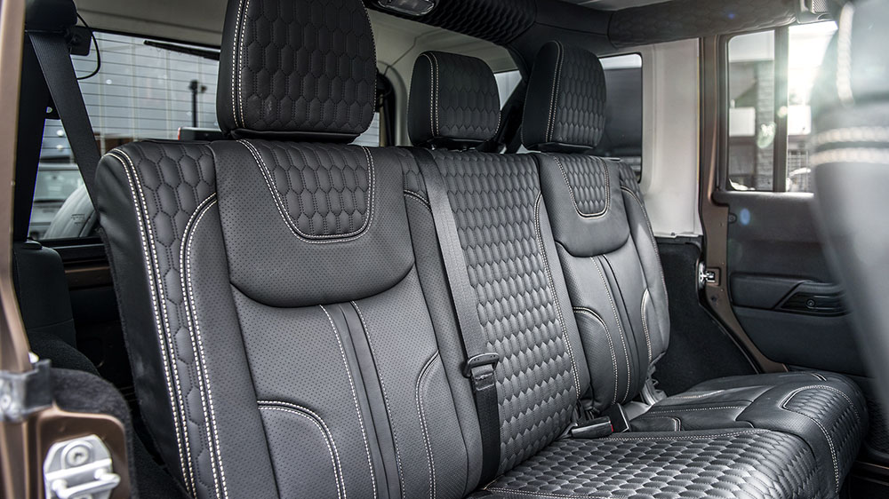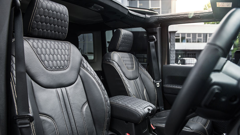 Drivers and passengers can switch gears from the brawny exterior of the Chelsea Truck Company Jeep Wrangler Night Eagle Black Hawk Edition to the soft and supple interior. New stainless steel door entry sills greet occupants as they are treated to new quilted and perforated leather GTB Sport seats with Silver contrast stitching. The same upholstery design is worn by the center glove box, arm rests, and roof liner for a custom-tailored luxury atmosphere. Drivers also benefit from a new set of vented and machined aluminum foot pedals.