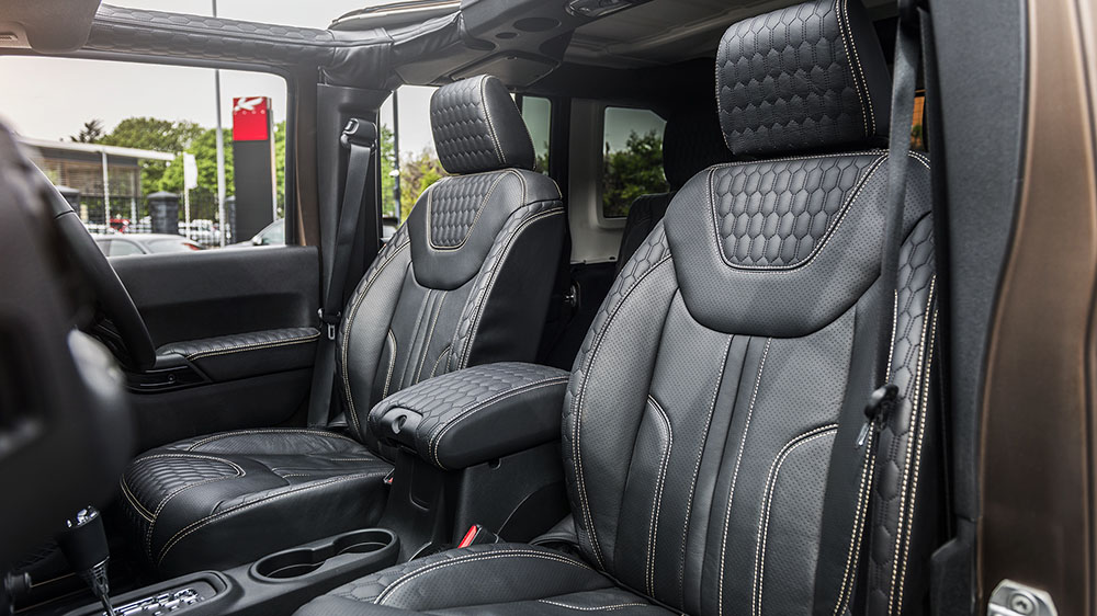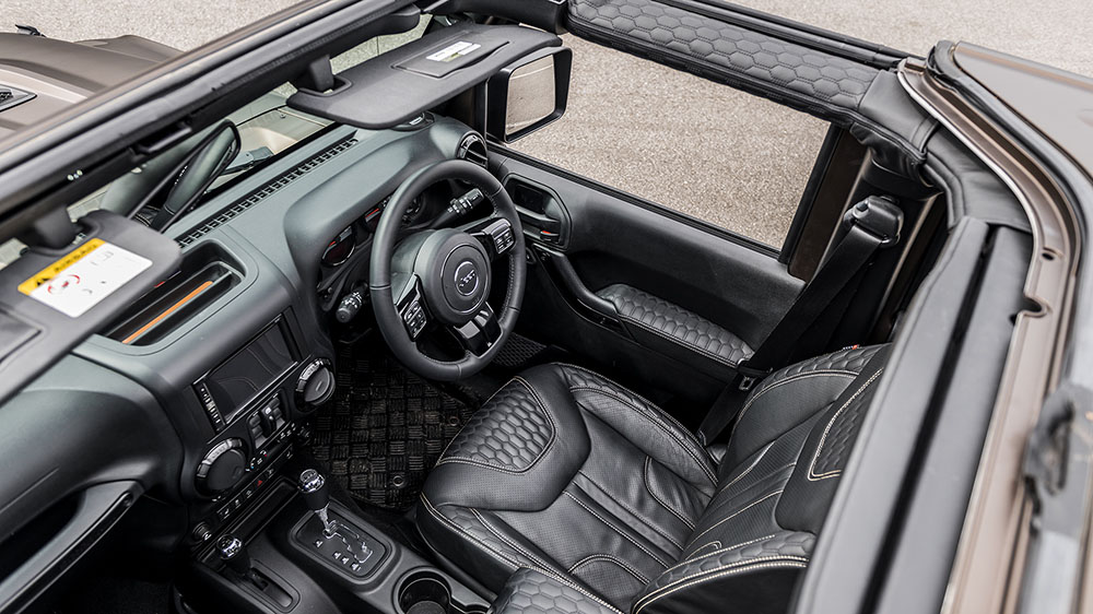 Beneath those muscular fenders sits a new set of Jeep 1941 wheels that give the American SUV a classic look. The new Jeep 1941 wheels measure 17 x 7.5 at the front and rear, and are shod in fresh 285/70/17 Cooper Discovered all-terrain tires. New mud flaps and a quad 100 mm cross-hair exhaust tailpipe setup adds even more testosterone for those off-road excursions.