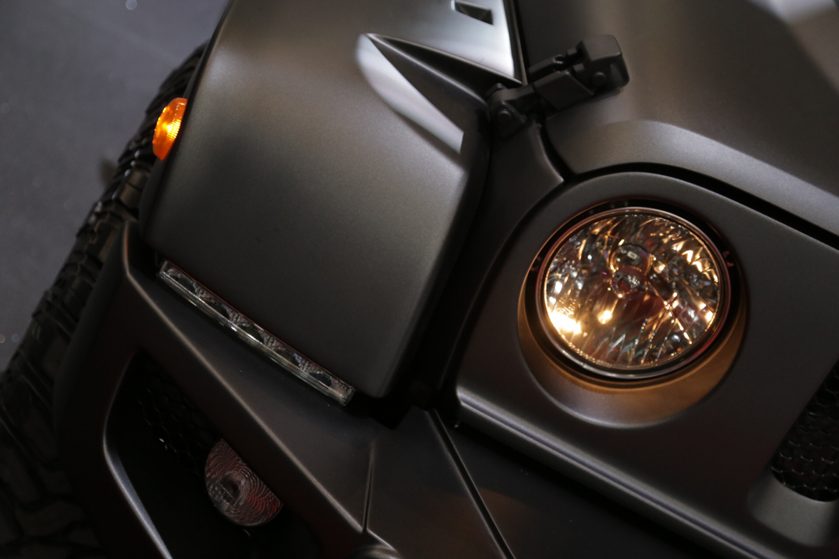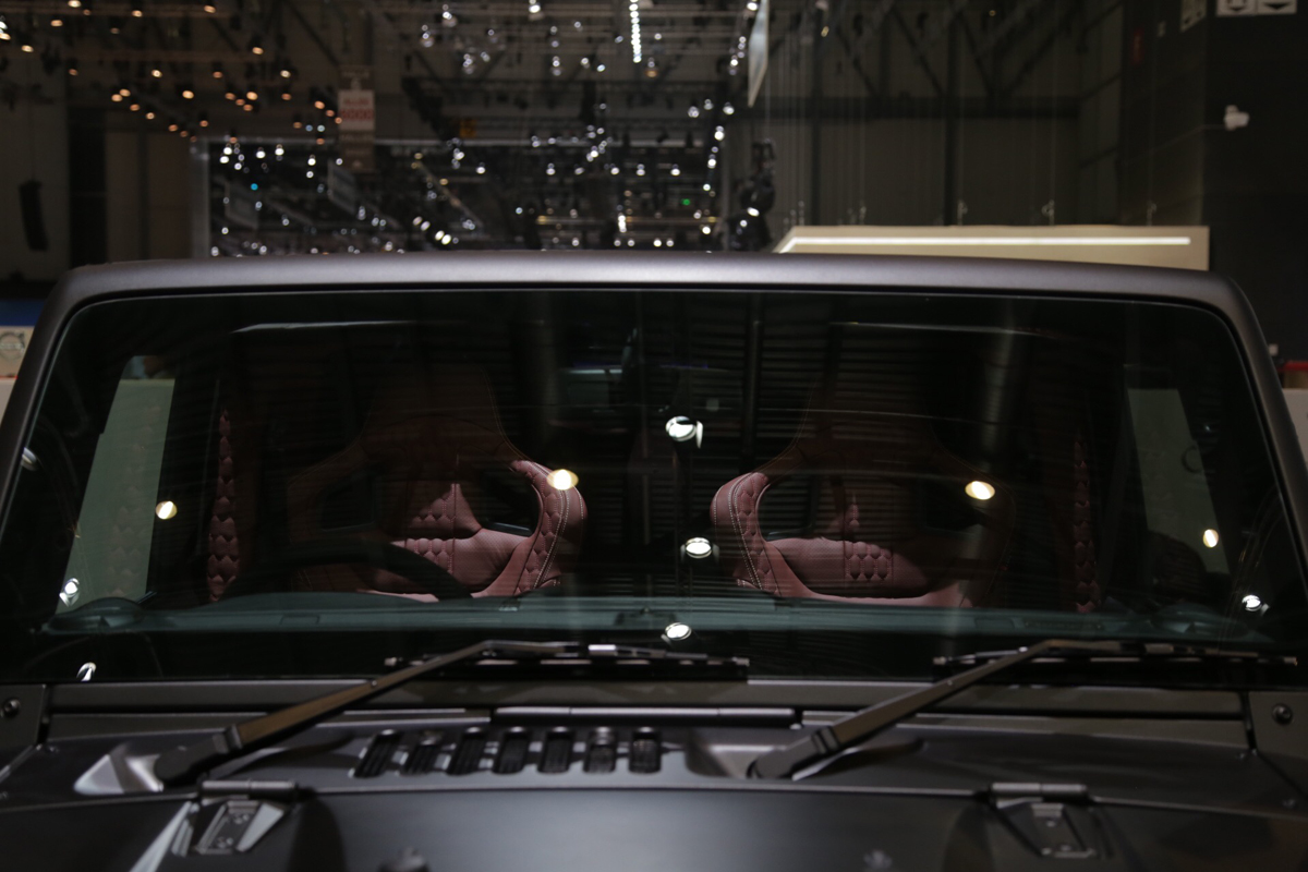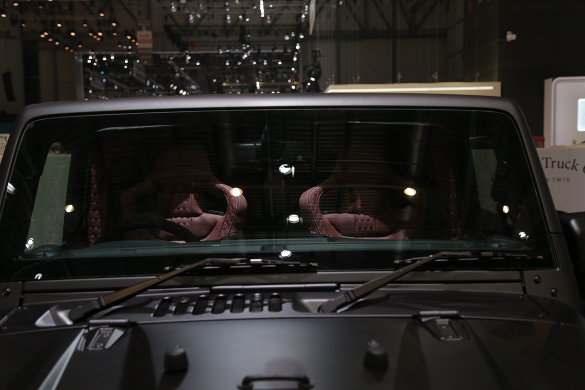 The featured Geneva Motor Show vehicle wears a smooth Volcanic Rock exterior color that covers the entire body. Extending outwards are new fenders with exposed bolt apertures for a tougher look. The front fenders match the new bumper assembly with its widened look as well. Above the bumper is a new, iconic four-slot Chelsea Truck Company grille with industrial mesh sitting between two smoked, round headlights. Adding to the more aggressive look up front is an Iron Man hood with integrated vents.