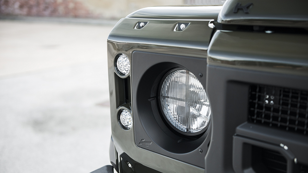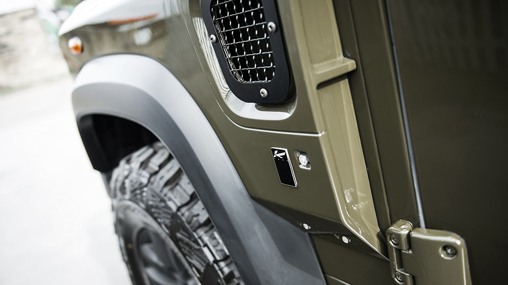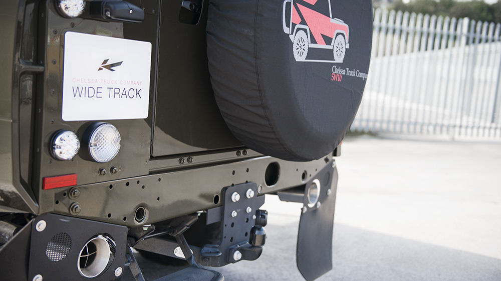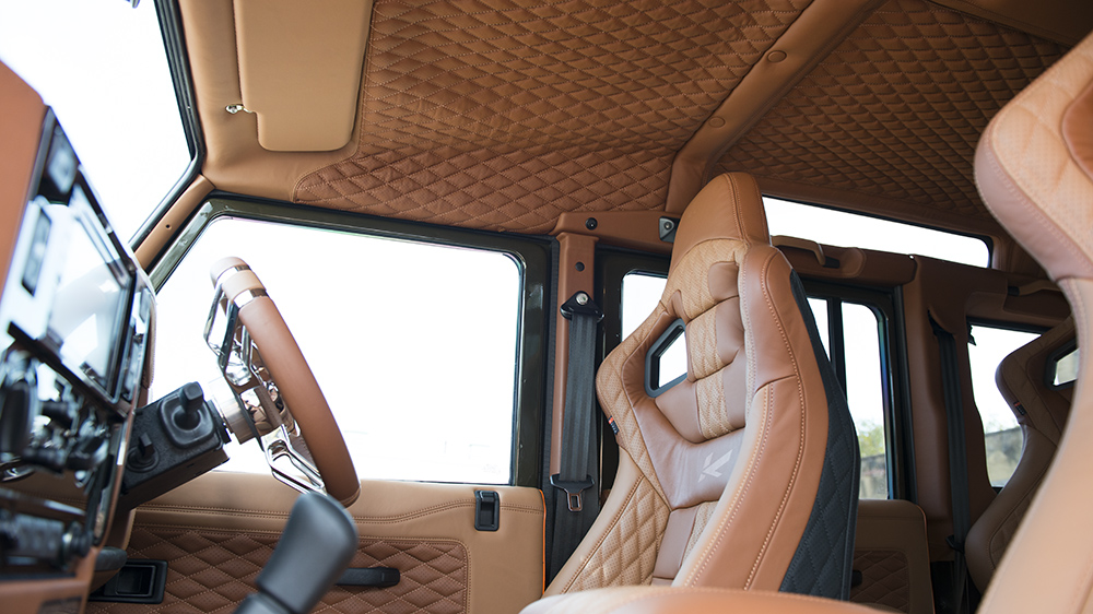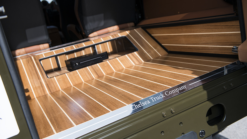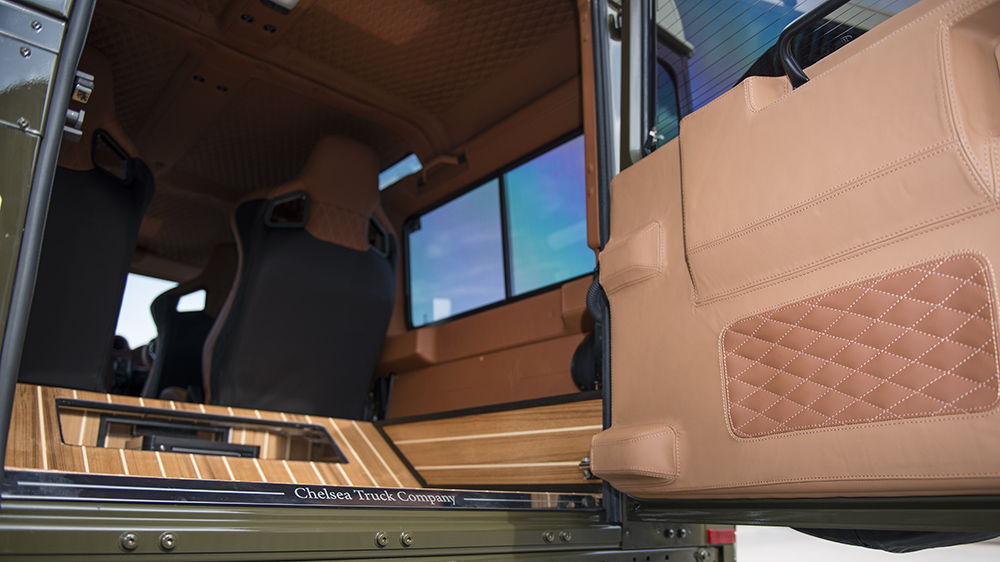 The best of both worlds starts with the Chelsea Truck Company Wide Track exterior kit. Both the front and rear wheel arches extend outwards for a brawnier, tougher look. The front fascia sports a new X-Land front grille in matching Fungus Green and Old England White, just like the exterior color and roof combo. A new front bumper incorporates new lighting elements, cross-hair military headlights, and a sump guard, while mesh hood vents keep the engine bay cool. At the rear sits a large Chelsea Truck Company spare wheel cover to make its new styling even more apparent.