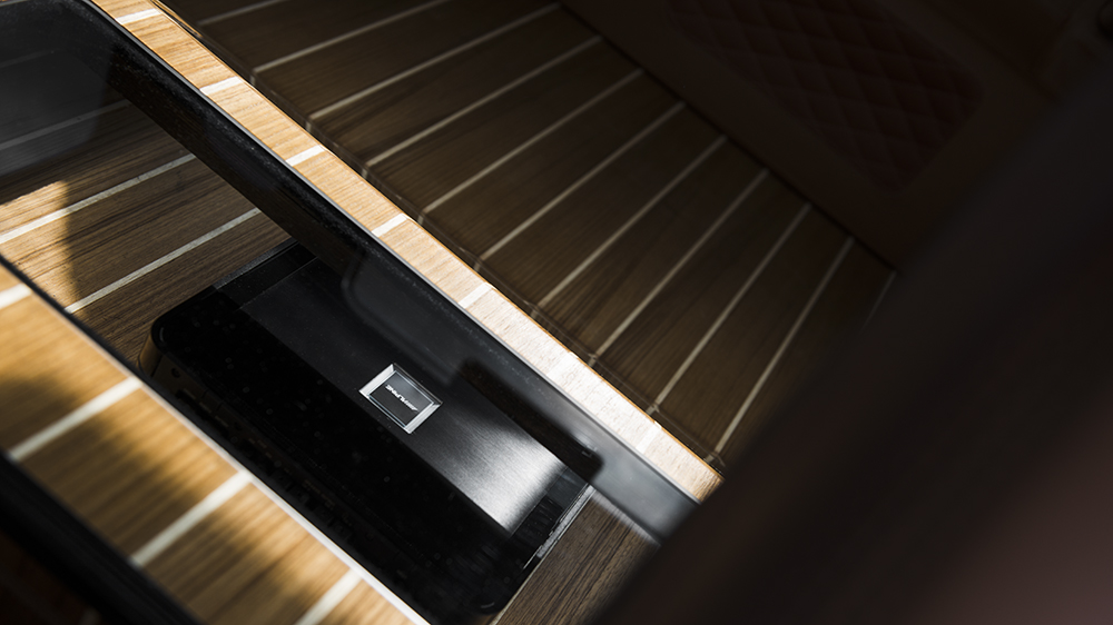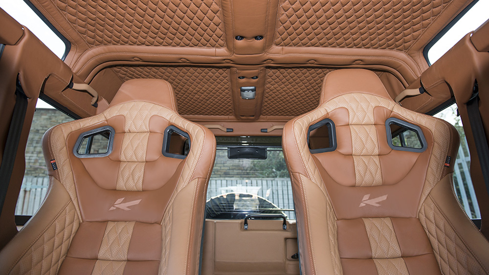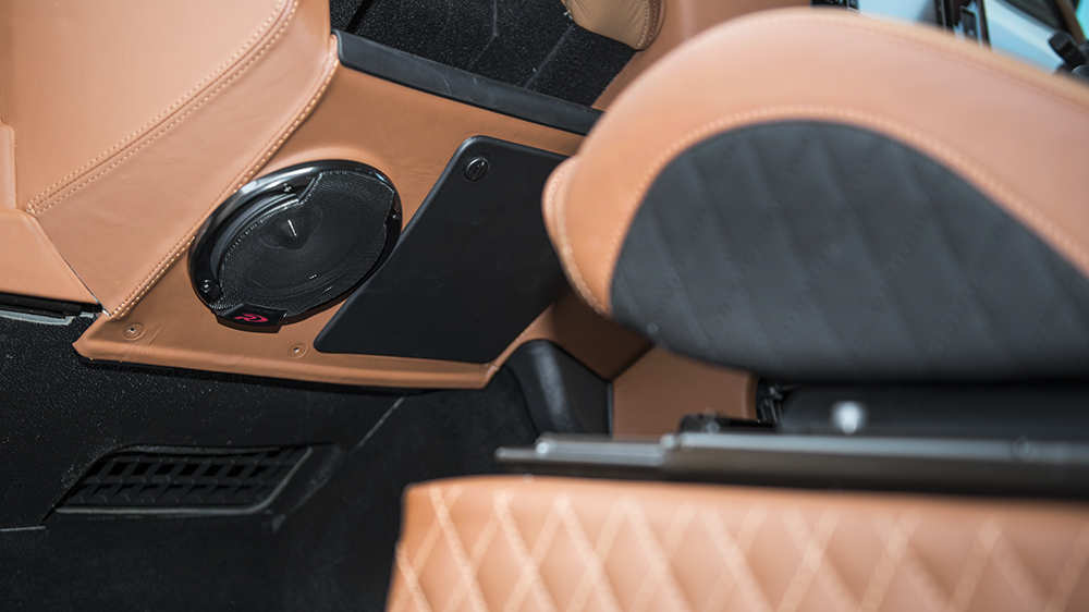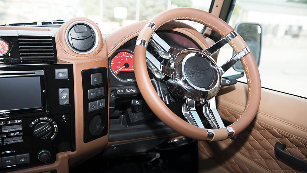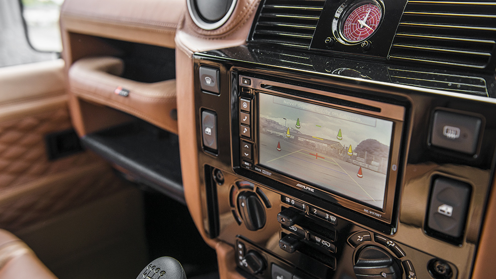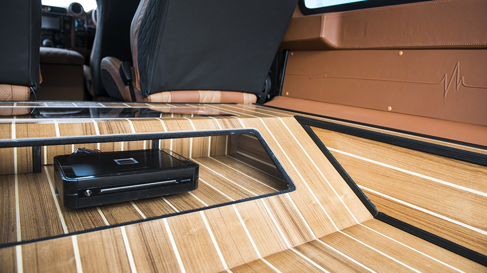While most observers would take the Defender 2.2 TDCI XS 110 Chelsea Wide Track as a rugged off-road, purposeful machine, they’d be surprised after stepping inside the luxurious cabin. Dark-tinted privacy glass hides the perforated tan nappa leather front and rear GTB sport seats and matching center glove box, passenger dashboard, grab handles, door panel inserts, instrument binnacle, rear door panel, roof headliner, and sun visors. Providing a better driving experience are new gauges in red, an alpine satellite navigation system, Kahn billet steering wheel, vented and machined aluminum foot pedals, reverse camera, and a Churchill time clock. New door entry sill plates, rear cabin access LED lighting, and more add to the wealth of luxury inside the Defender. The rear space holds one of the exciting upgrades, where the floor space has been replaced with teak decking, where the transparent pod for the Alpine stereo amplifier sits.