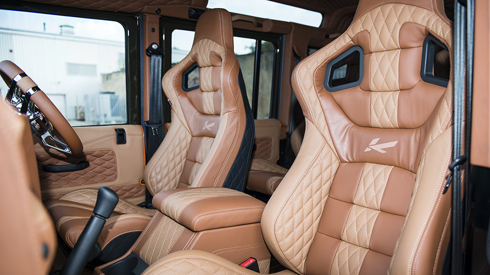 The new Land Rover Defender 2.2 TDCI XS 110 Chelsea Wide Track is currently available for £ 72,875.00 with its Fungus Green exterior, discreet Kahn badging, and tan nappa leather interior.