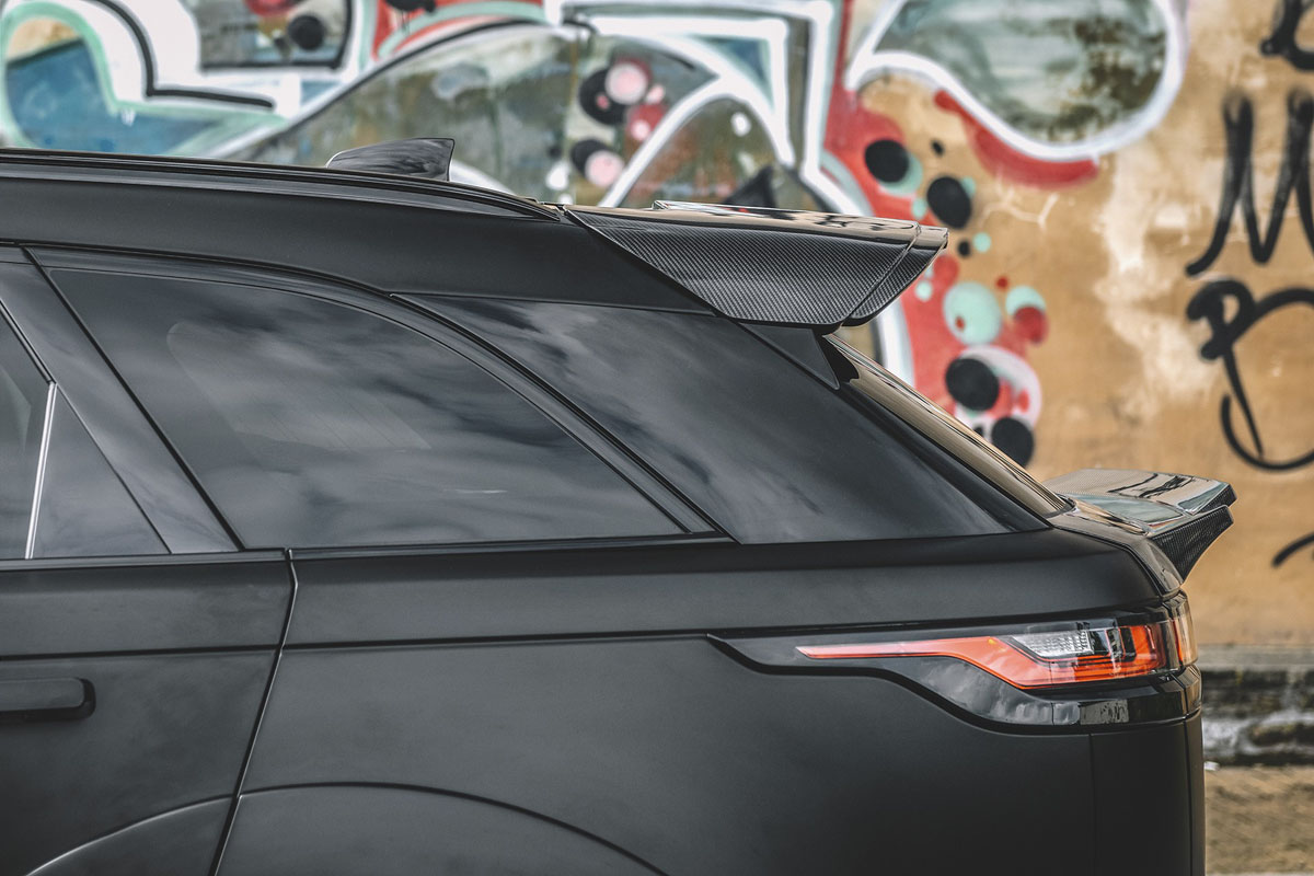 Visually, the Project Kahn Range Rover Velar P300 Pace Car has a new Satin Black body with subtle Bronze detailing and full carbon fiber body work. Up front, there’s a new bumper spoiler that extends outwards and a three-piece vented grille that gives the SUV a muscular look. Each fender also benefits from a new wide wheel arch with integrated air dam that gives the Velar P300 Pace Car an intimidating road presence. At the rear, a new roof wing and trunk wing combo proudly sit to reflect the SUV’s sportiness.