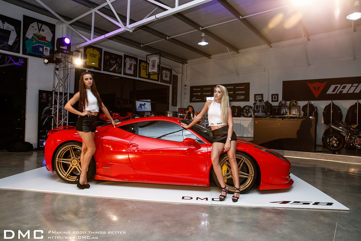 The DMC Ferrari 458 Elegante featured here beside two lovely models in South Africa was built by RACE! and shown off in South Africa. The supercar features a new front lip with side extensions that curve upwards as they move towards each side where they meet the wheel arch. The new side skirts feature the same design and taper upwards towards the rear fenders to optimize airflow away from the wheels.