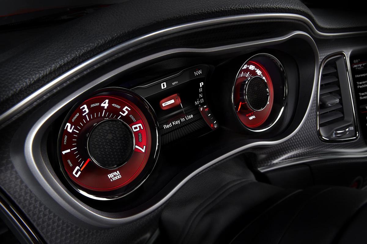 The Challenger SRT Hellcat gets two individual keys: One in black for reduced output and another red one to unleash the full 600-plus-horsepower output. There is even a PIN-activated Valet mode for both variants that, among other things, limits power and access to the first gear.