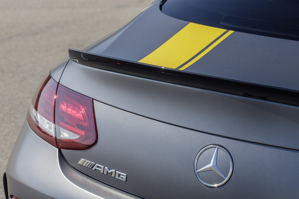 Both of the Mercedes-AMG C63 Coupe Edition 1 models wear an aggressive AMG Aerodynamics Package. The kit is finished in high-gloss black and features a new front spoiler, side skirts, rear airflow breakaway edges, rear diffuser, and trunk spoiler. The AMG Night Package with high-gloss black parts and chrome tailpipes also comes standard.