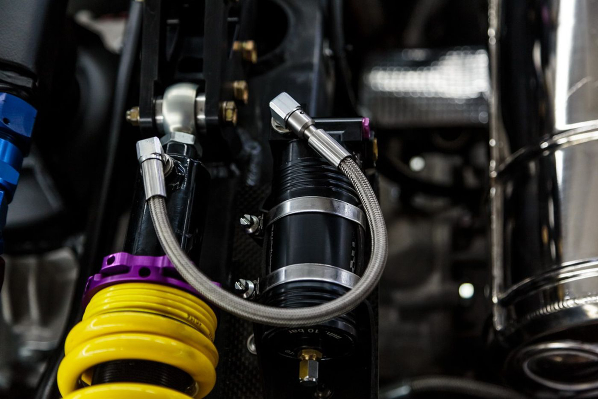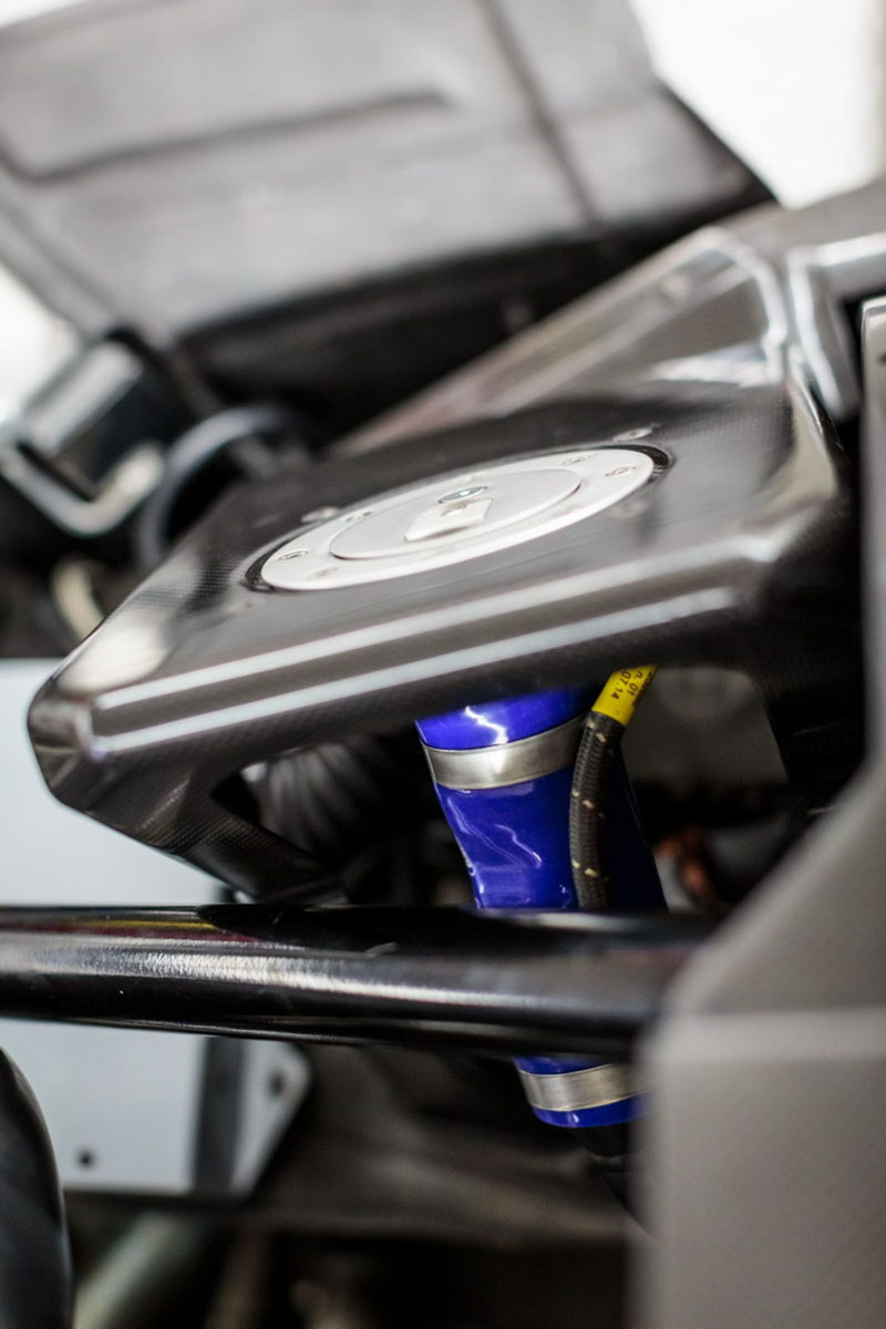The edo MC12 VC could only slightly deviate from the racing car to meet road-legal requirements. Conveniences like the ability to refuel at a standard fuel station were needed along with door locks, a properly ventilated windshield, street-legal wheels and tires, proper lighting and signals, and a front-end fan-supported cooling system. The chassis had to be upgraded with an adjustable suspension that had track and street settings alongside a disc brake setup with proper cooling and emergency braking.