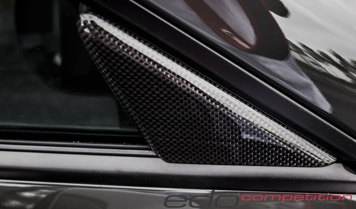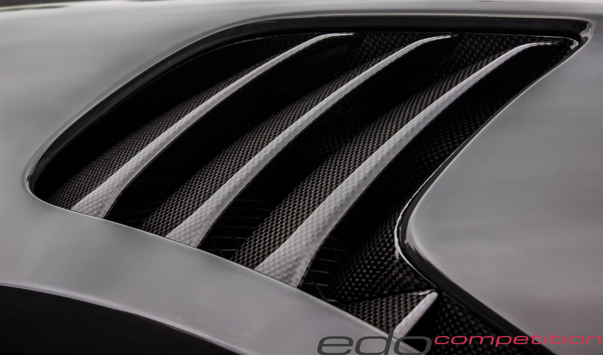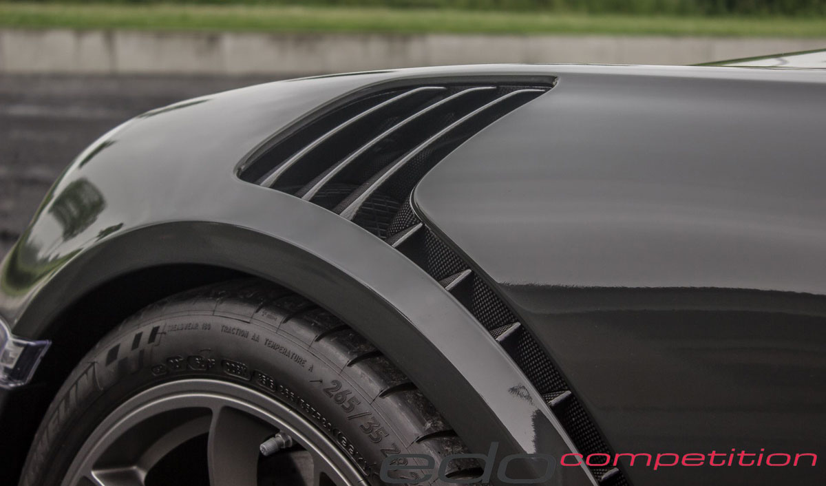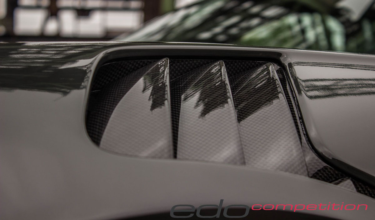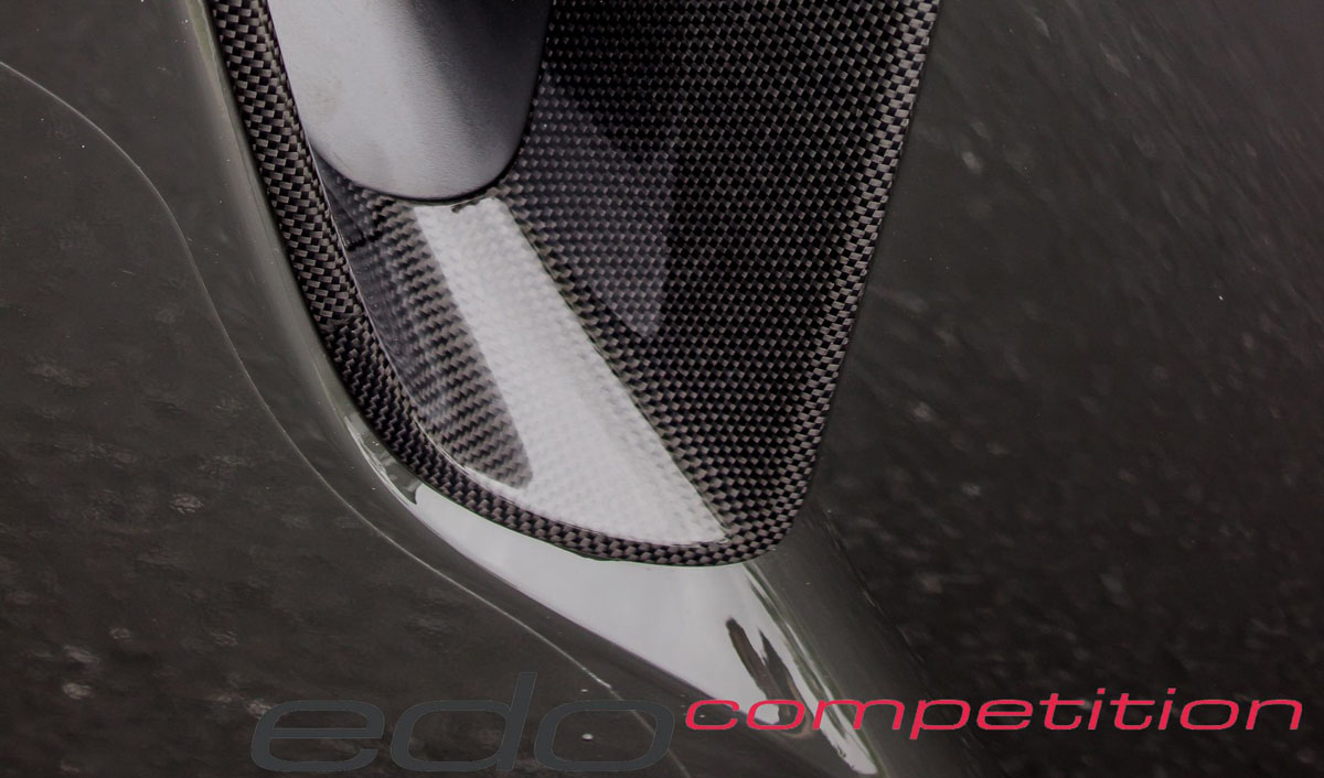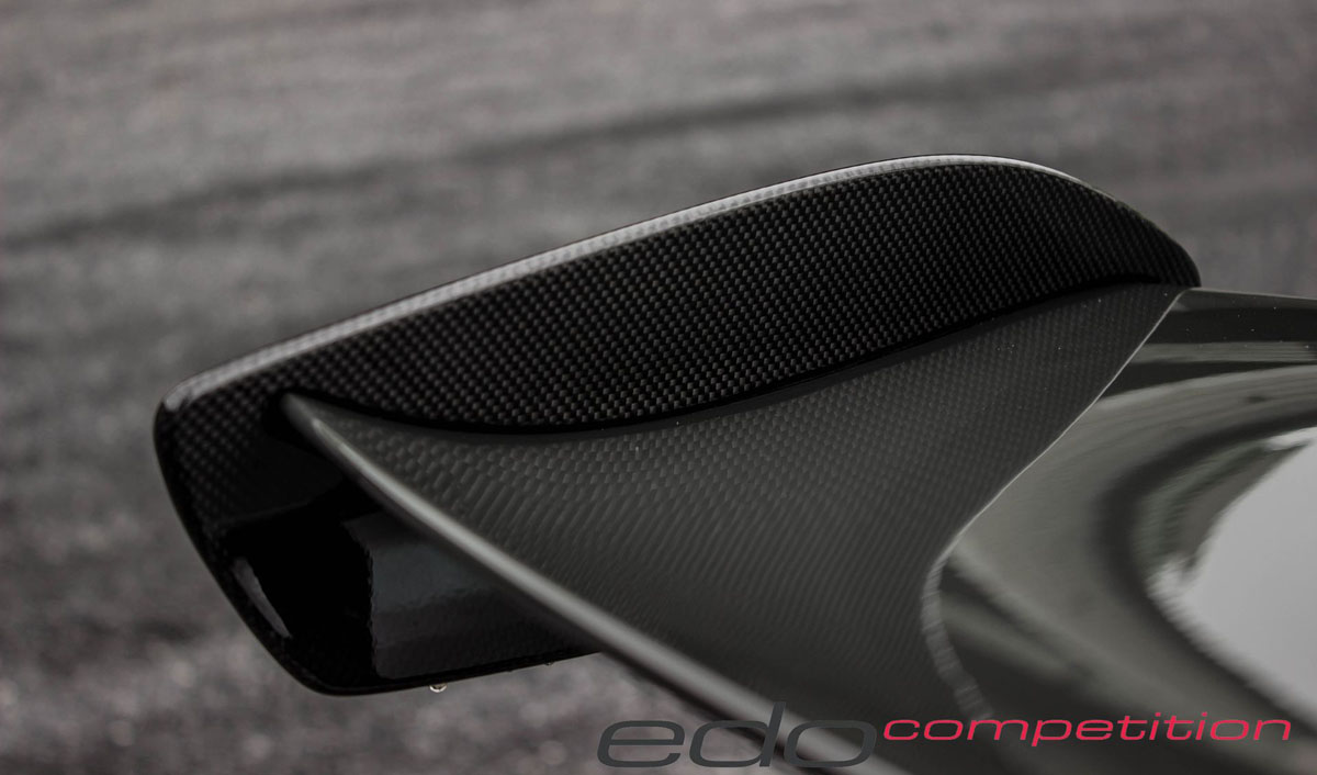 As air moves towards the rear, it’s met by new edo competition carbon fiber air intakes in the rear fenders, sending it into the high-revving engine. A carbon fiber cover is also worn by the air intake while a large carbon fiber rear wing raiser sits above to generate downforce.