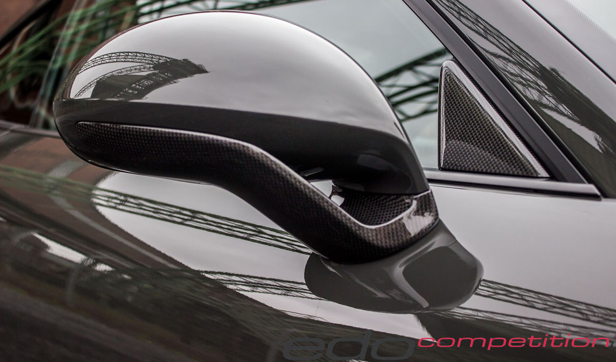 The already exotic racing looks of the Porsche 911 GT3 RS benefit from lightweight carbon fiber components in a matte or glossy finish from edo competition. Up front, new carbon fiber fender outlets show off where hot air can escape after it’s generated by the massive brakes. New mirror covers are complemented by new triangle carbon fiber window covers in the front corner.