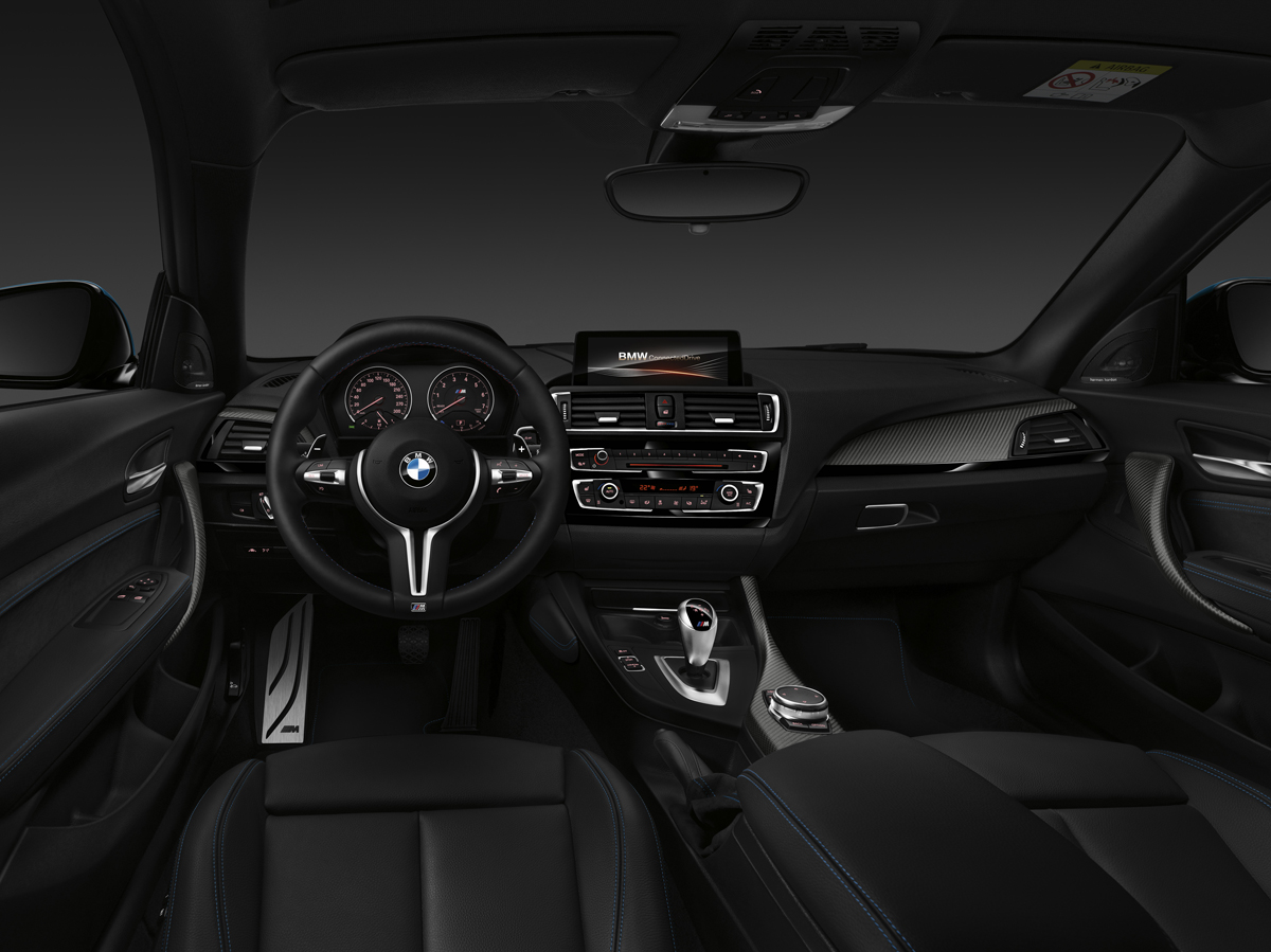 The 2016 BMW M2 also brings the M-sport fun to the interior where new sports seats wearing black Dakota leather with blue stitching and M-logos on the backrests hold driver and passenger in place with adjustable side bolsters. M footrests, knee pads on the center console, M2 specific dials and gauges set it apart from the standard 2-Series model. Carbon fiber and Alcantara were the choice to trim and finish the cabin.