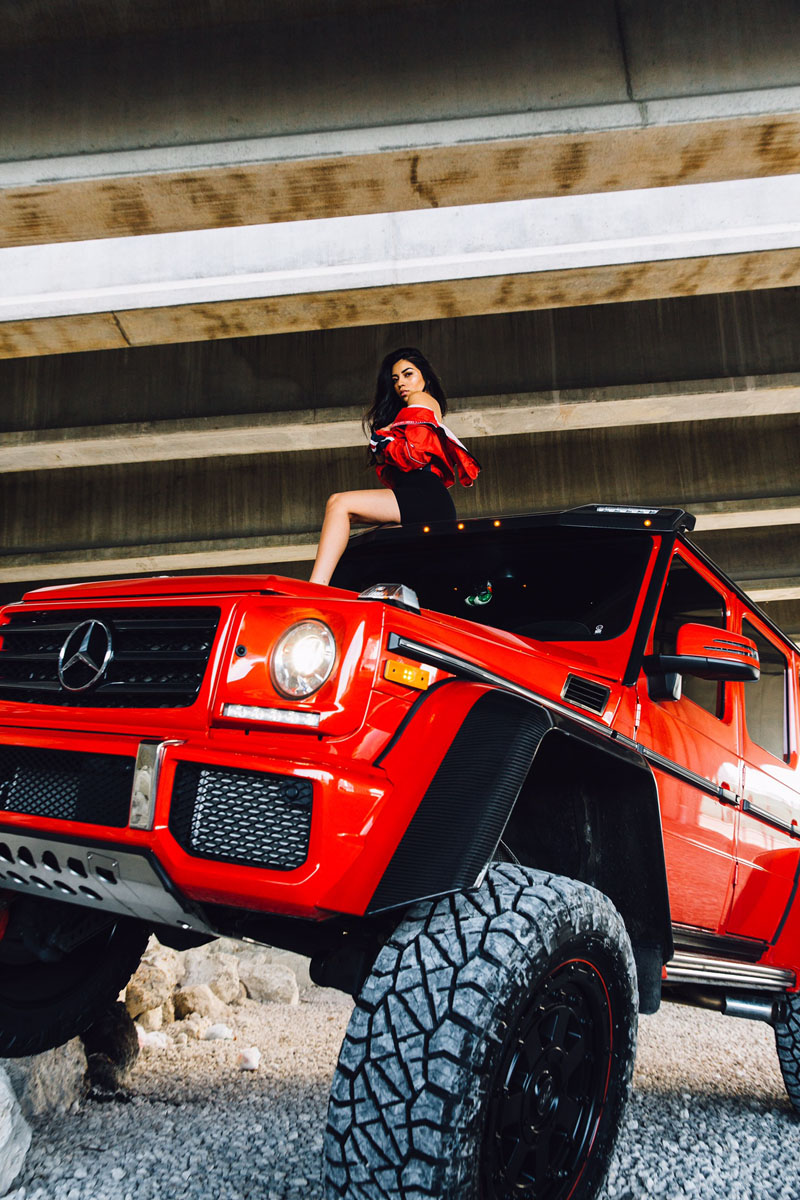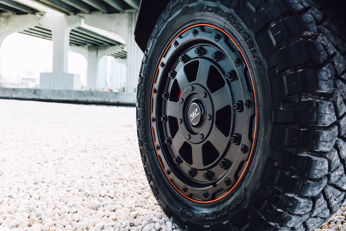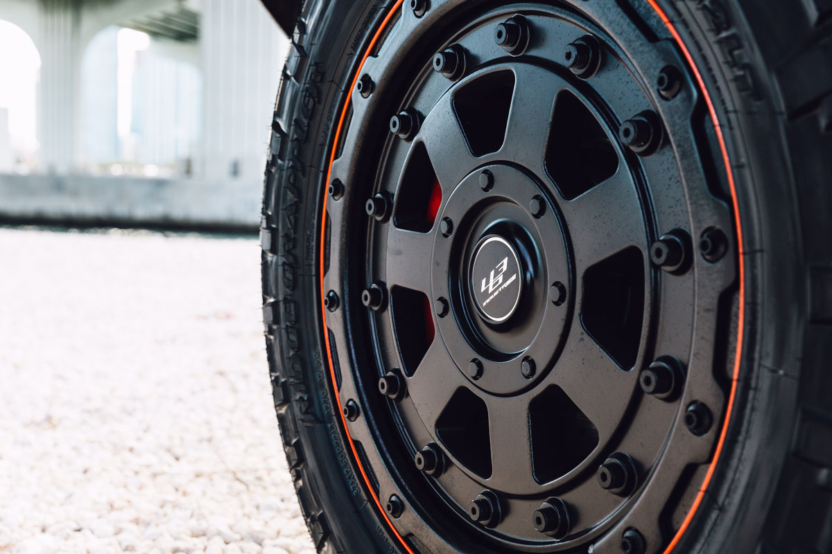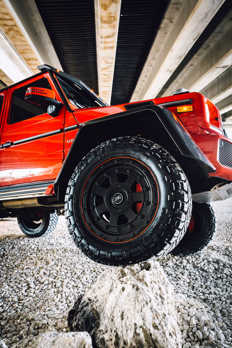 This eye-catching Red Mercedes-Benz G550 4×4² was equipped with a new set of 463 Industries GC01 wheels that were designed exclusively for the Mercedes-Benz G-Class Wagon and 4×4². The GC01 wheels perfectly showcase the rugged capability and brawn of the German SUV with their seven-spoke face sporting a stamped aluminum bead lock ring with steel hardware.