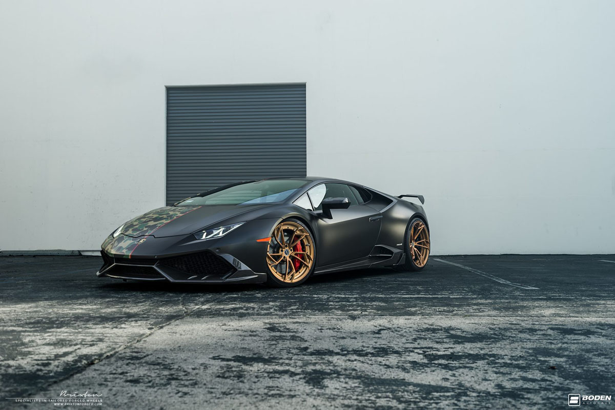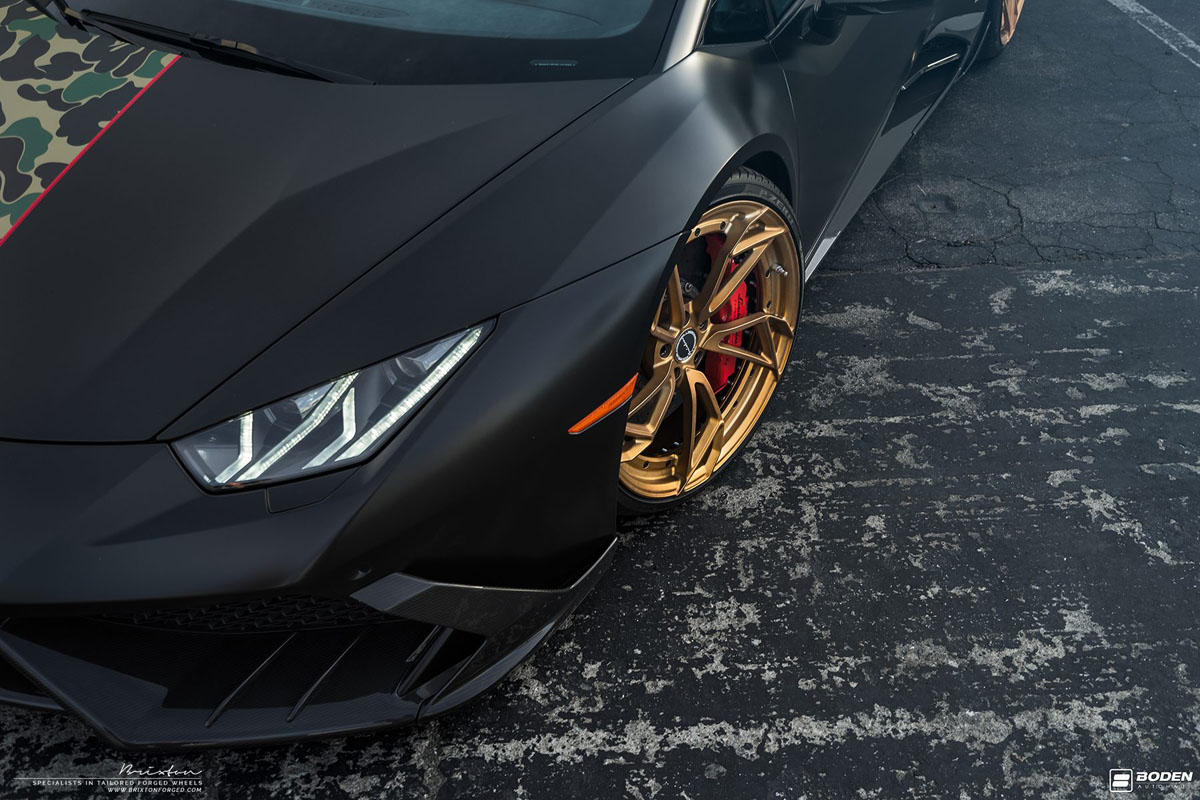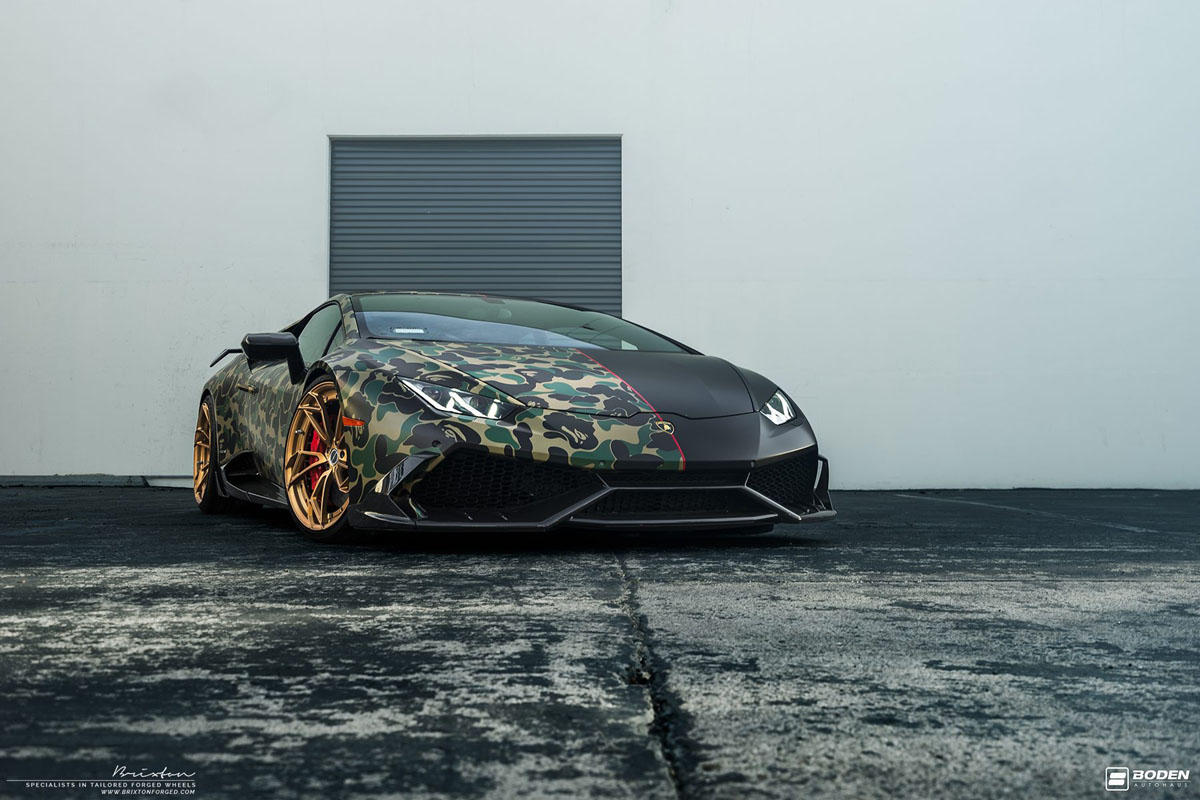 Visually, this Lamborghini Huracan project by Boden Autohaus is even more angular and dynamic than its factory counterparts. New aerodynamics on the front fascia, rear fenders, and rear fascia slice through air to generate more downforce, improve cooling, and make this V-10 monster look even more menacing. Finishing it off is a new Bape wrap from Impressive Wrap that has a smooth satin black on one half of the Huracan while an old-school camouflage is worn on the other half and separated by a thin red line.