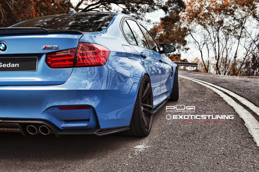 The visually-attractive Yas Marina Blue paint of the BMW M3 was contrasted by the custom Textured Bronze finished PUR RS07 wheels that sit at the other end of the color spectrum. The 9.0 x 20 front and 11.0 x 20 rear forged monoblock wheels instantly add character and visual power to the German sports sedan with their staggered fitment and finish.