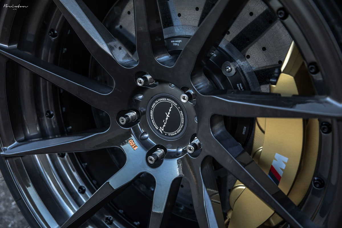 Deciding on the right setup, finish, and sizing for this fitment took quite some time, but @Carnucopia and Brixton Forged were able to settle on the perfect design. The Brixton Forged R10D wheels were installed in a staggered 9.5 x 20 front and 21 x 11.5 rear setup and boast 50/50 PVD Black Titanium Hardware. Each wheel also features a stunning brushed Smoke Black (Gloss Clear) finish with BMW’s Acid Orange accents to match the car’s color scheme.