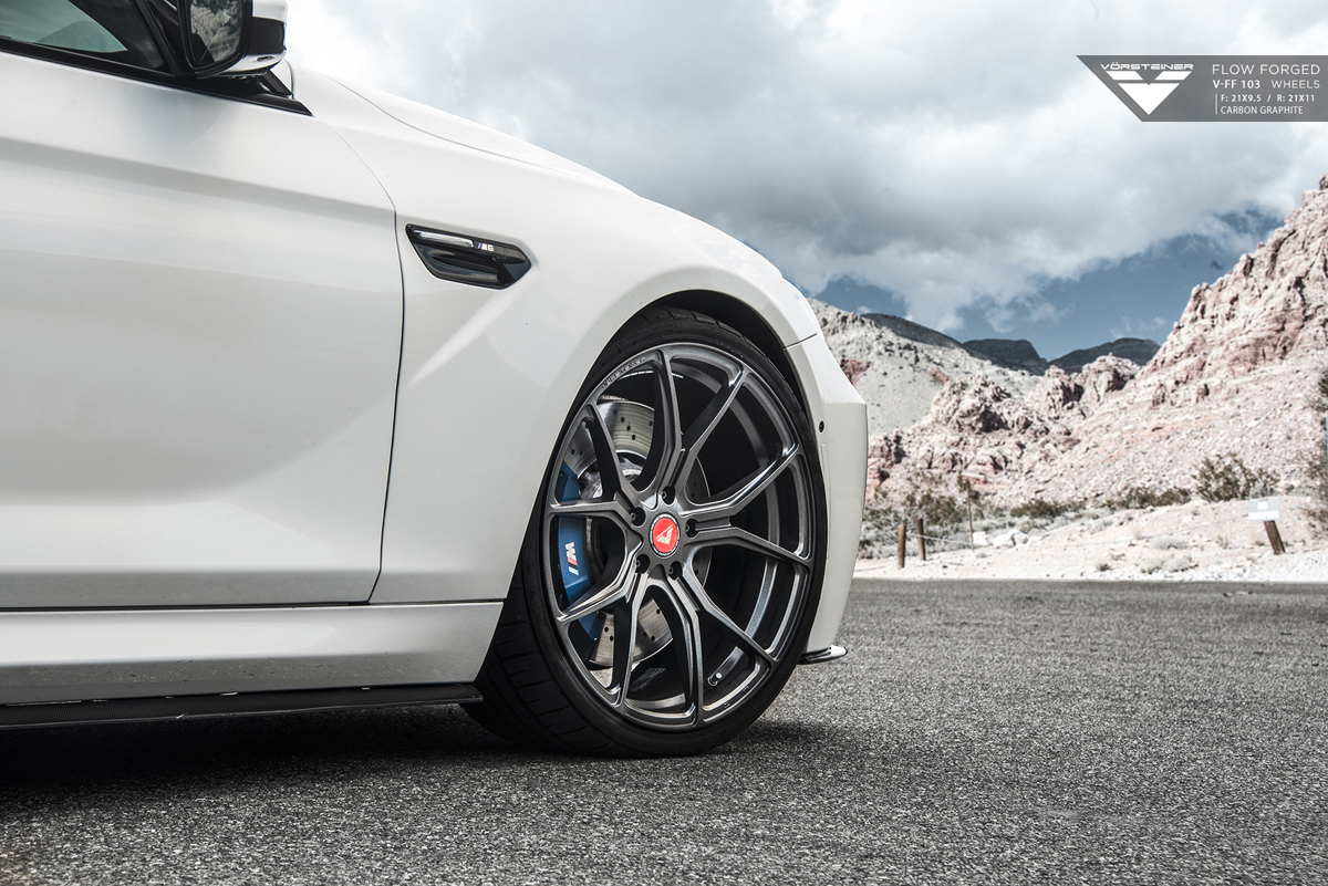 Up front, the Vorsteiner V-FF 103 wheels were installed in a 9.5 x 21 setup with a standard concave profile to create more depth. At the rear, the wheels measure a staggered 11.0 x 21 size and wear a more aggressive deep concave profile, drawing attention to the rear-wheel drive layout of the BMW M6. A slick Carbon Graphite finish adorns each of the V-FF 103s for a slight contrast to the vibrant white exterior paint.