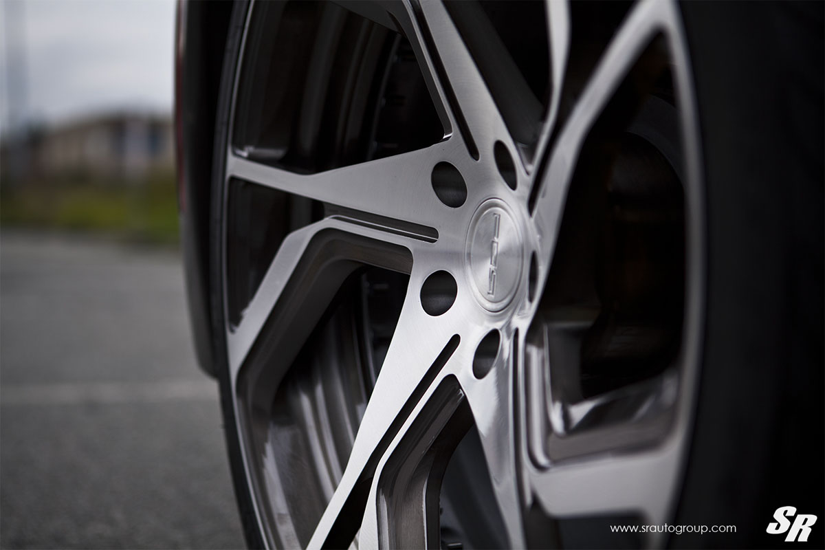 Filling in those beefy fenders is a new set of custom-tailored PUR RS12 wheels installed by SR Auto Group. These forged monoblock wheels feature a twisting five-spoke design where each spoke splits as it extends towards the edge of the rim. A three-dimensional concave depth progresses from the front to the rear, emphasizing the rear-wheel drive layout. Weight is also a priority here as well, with the forged 6061-T6 aluminum alloy construction and side pocketing reducing rotating mass as much as possible for better overall performance.