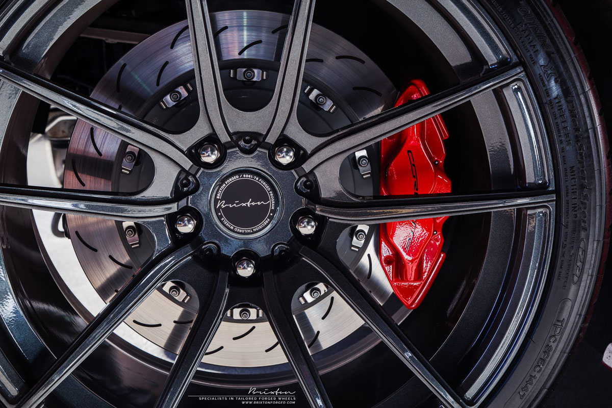 But weight is only part of the equation with this fitment. The Brixton Forged M53 Ultrasport+ wheels are set to stun and wear a darker Graphite color with a Gloss Clear finish that complements the black accents throughout the supercharged sports car. Up front, the forged wheels measure 10.0 x 19 while the rear comes in with a staggered 12.0 x 20 setup along with a deeper concave profile to emphasize the drivetrain layout.
