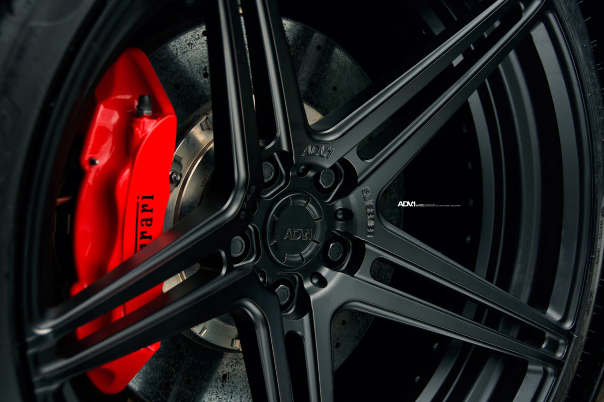 The Nero Ferrari 458 Italia was outfitted with a fresh set of custom ADV05 M.V2 SL Series two-piece forged wheels. These ADV.1 SL Series wheels are designed to be lighter and cut rotating mass for better overall performance for each individual vehicle platform. The five twin-spoke concave wheels feature a classic design along with weight-saving measures such as backpad pocketing and Titanium hardware, which is hidden for this application.