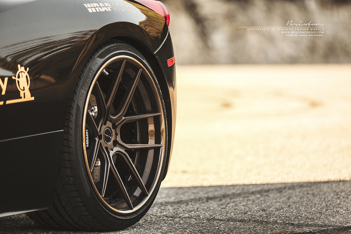 The lightweight 6061-T6 forged aluminum alloy wheels keep weight to a minimum where it matters most, allowing for ultimate performance. In the style department, the Brixton Forged CM5 Targa Series wheels don’t disappoint with their detailed Fine Texture Forged Bronze discs and Gloss Forged Bronze outer lips, adding a unique complementing touch to the exterior of the 458 Italia.