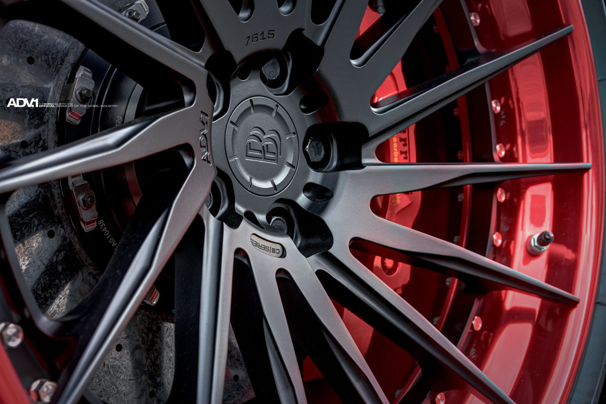 Each one of the ADV15R Track Spec CS wheels features a weight-optimized construction which keeps rotating mass at the wheel hub to a minimum for better overall performance. On this 488 GTB, the ADV15R CS Track Spec wheels were installed in a wide 9.0 x 20 front and 12.0 x 20 rear setup. Each wheel also features a Matte Black disc to complement the body while Polished Gloss Red lips capture attention with their vibrant color along with the exposed titanium hardware.