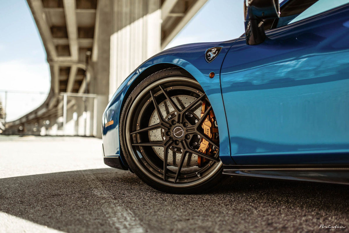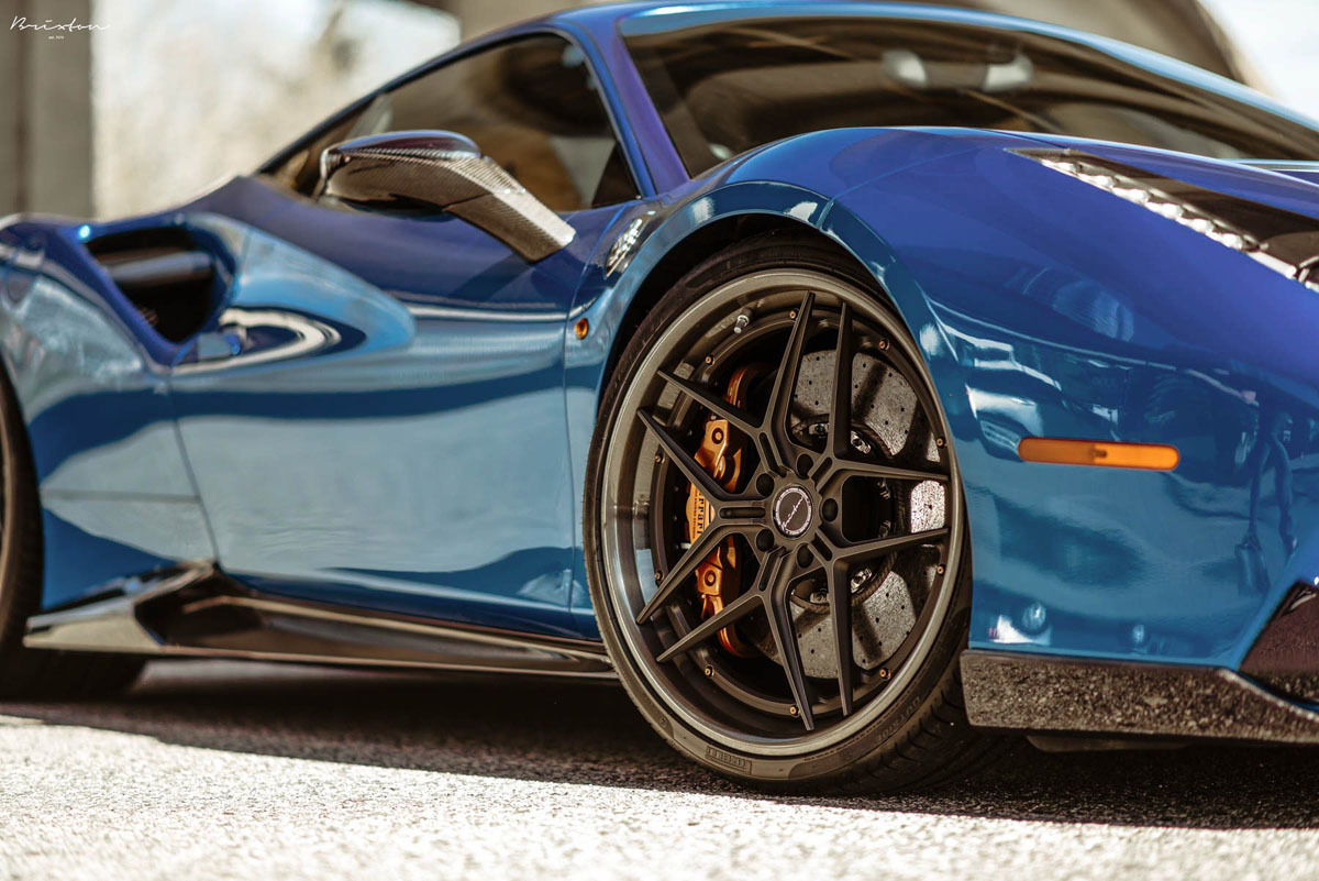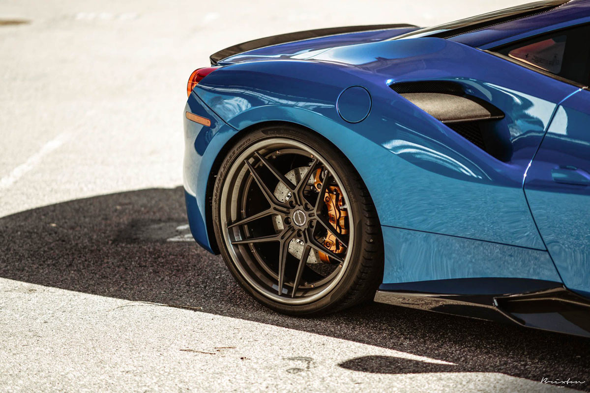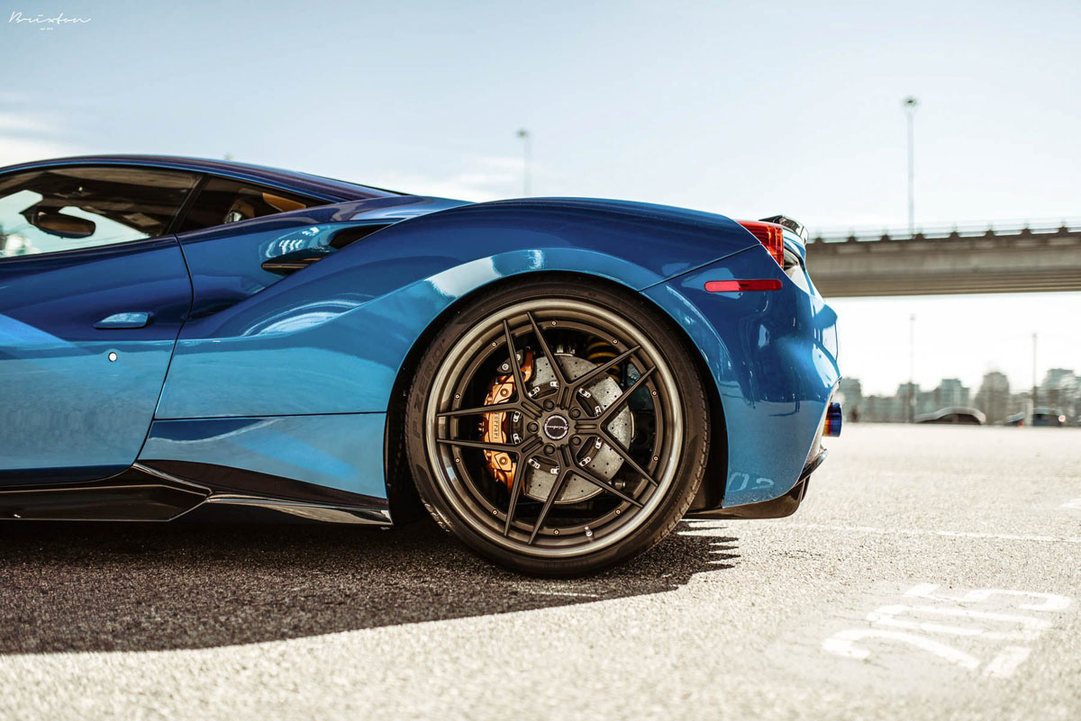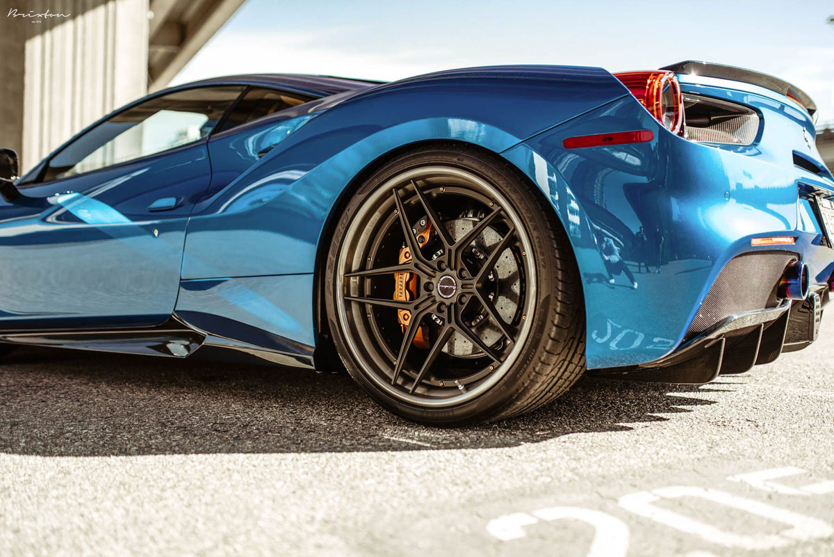 The new Brixton Forged WR7 Targa Series wheels were installed on this Blu Corsa Ferrari 488 GTB in a staggered 21 x 9.0 front and 22 x 12.0 rear setup with 255/30/21 and 335/25/22 tires that emphasizes the wedge-shaped profile of the super car. As an added bonus, the concave profile gets deeper from the front to the rear, creating a muscular stance. Each one of the Brixton Forged WR7 Targa Series wheels also sports a smooth 120-grit Brushed Smoke Black finish that contrasts the shimmering body perfectly.