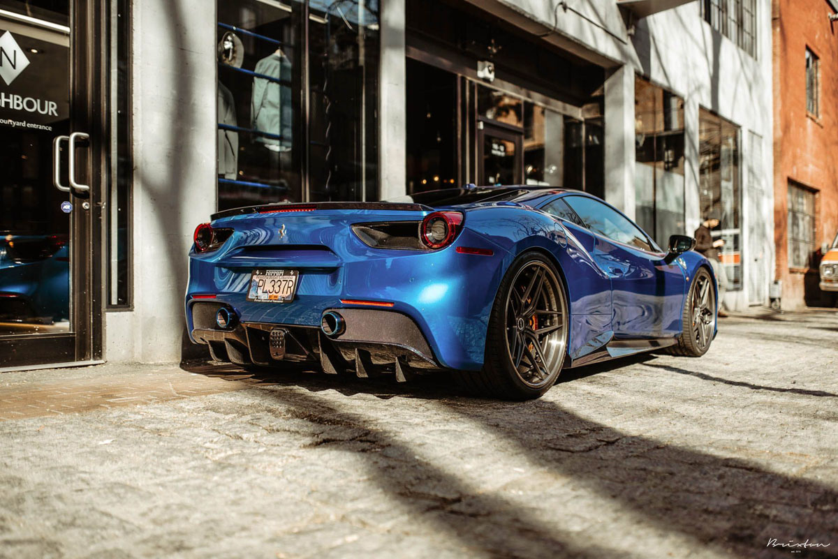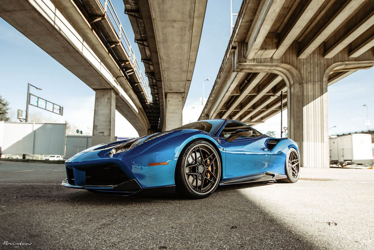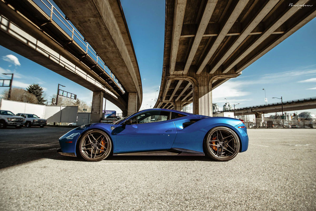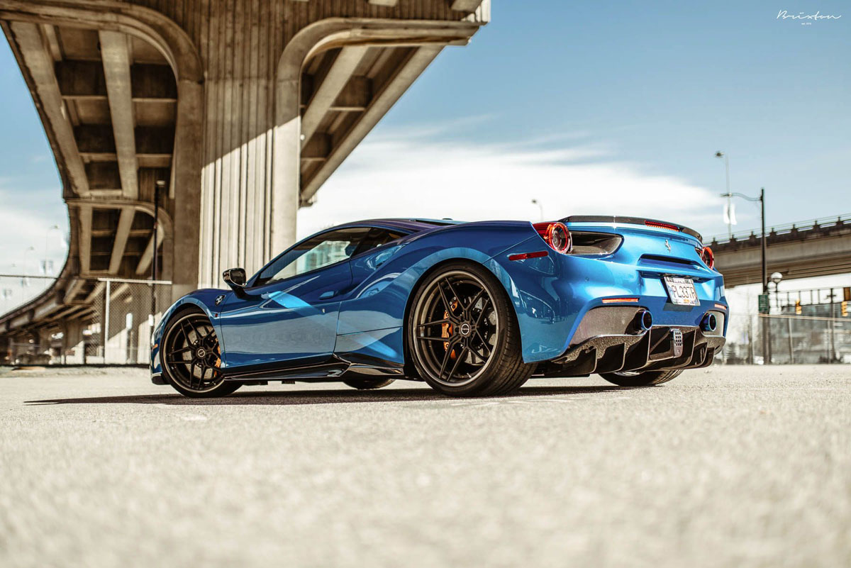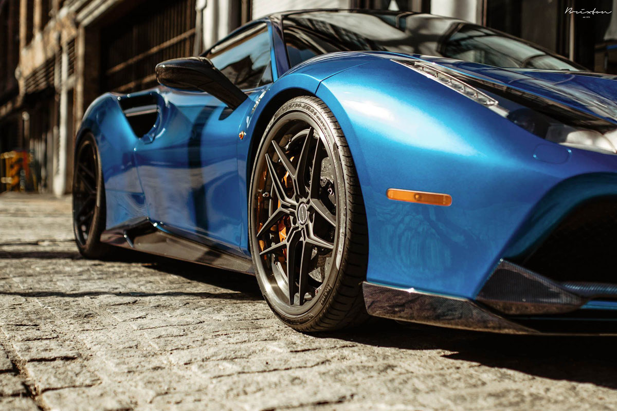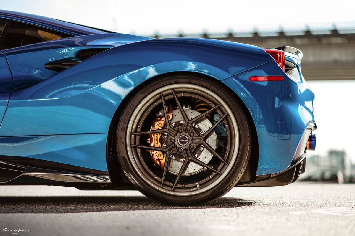 The new Brixton Forged WR7 Targa Series wheels were installed on this Blu Corsa Ferrari 488 GTB in a staggered 21 x 9.0 front and 22 x 12.0 rear setup with 255/30/21 and 335/25/22 tires that emphasizes the wedge-shaped profile of the super car. As an added bonus, the concave profile gets deeper from the front to the rear, creating a muscular stance. Each one of the Brixton Forged WR7 Targa Series wheels also sports a smooth 120-grit Brushed Smoke Black finish that contrasts the shimmering body perfectly.