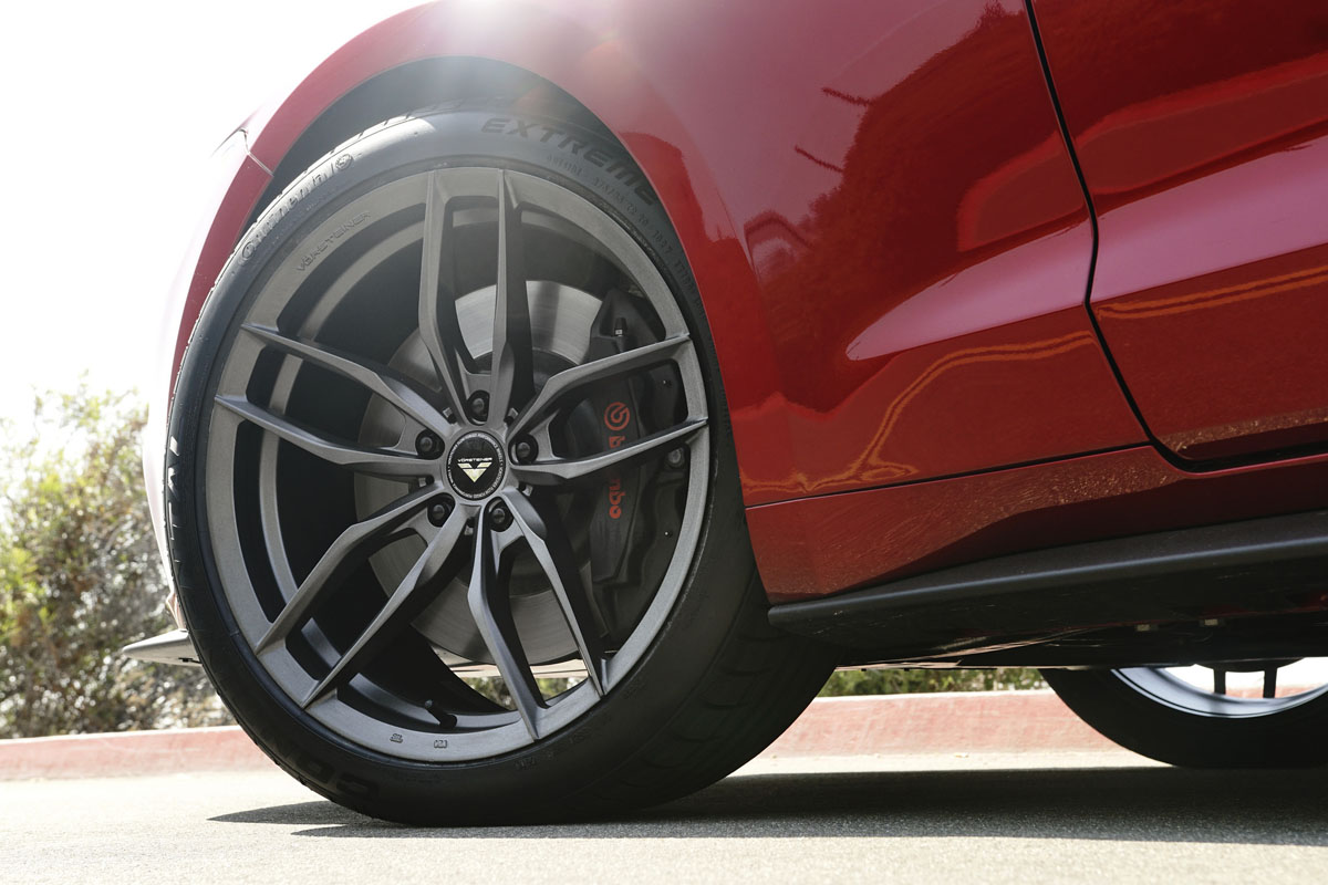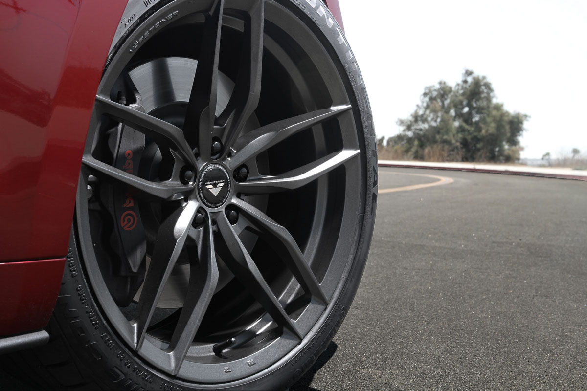 Staring ahead are a pair of 10.0 x 20 +40 front V-FF 105s while the rear comes in with a wider 11.0 x 20 + 40 setup for a larger footprint where it counts. Here, beefy 315/35/20 tires can be found while lower profile 275/35/20 tires are used up front. A slick Carbon Graphite finish adorns each of the V-FF 105 wheels and works perfectly with the slight tint found in the Ruby Red exterior paint.