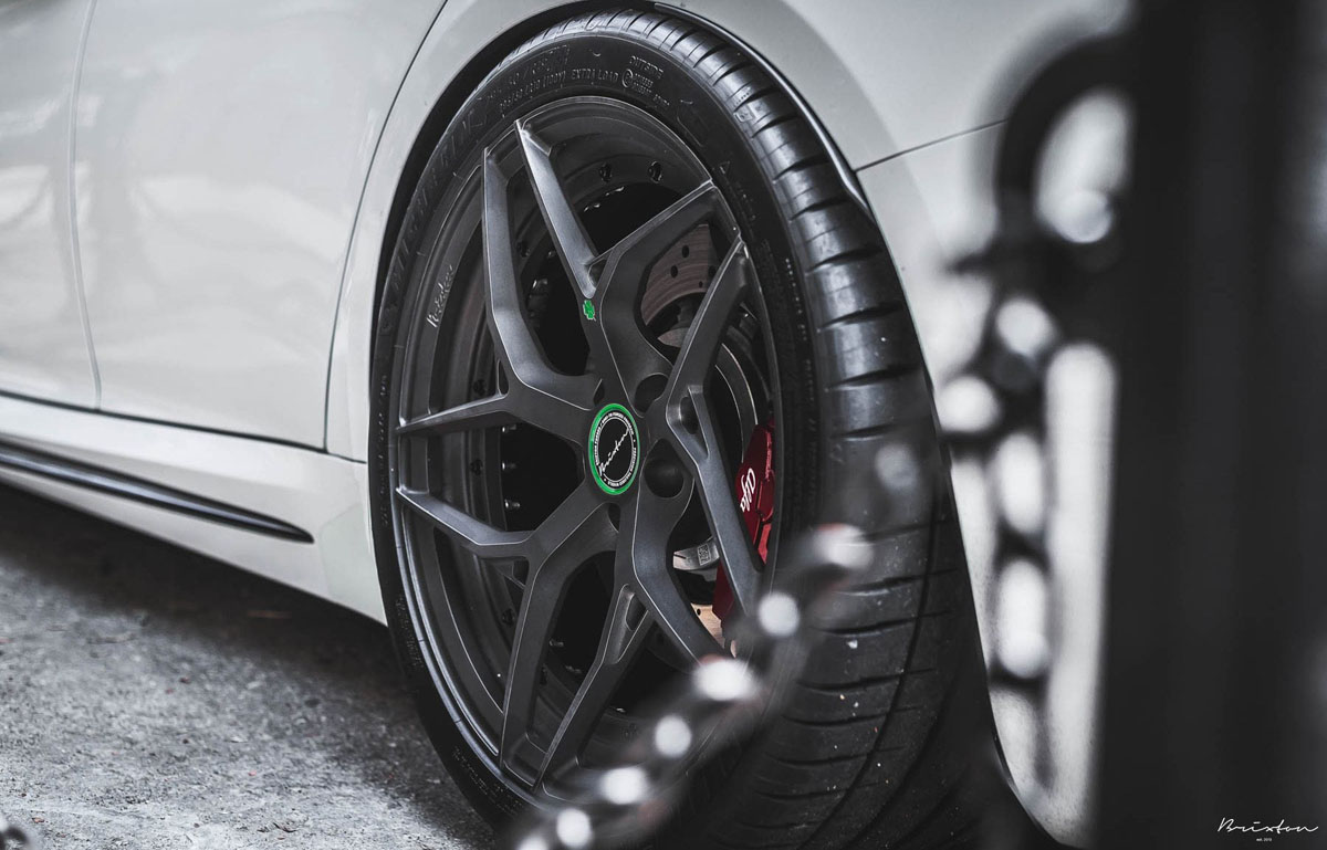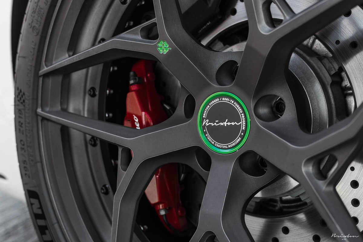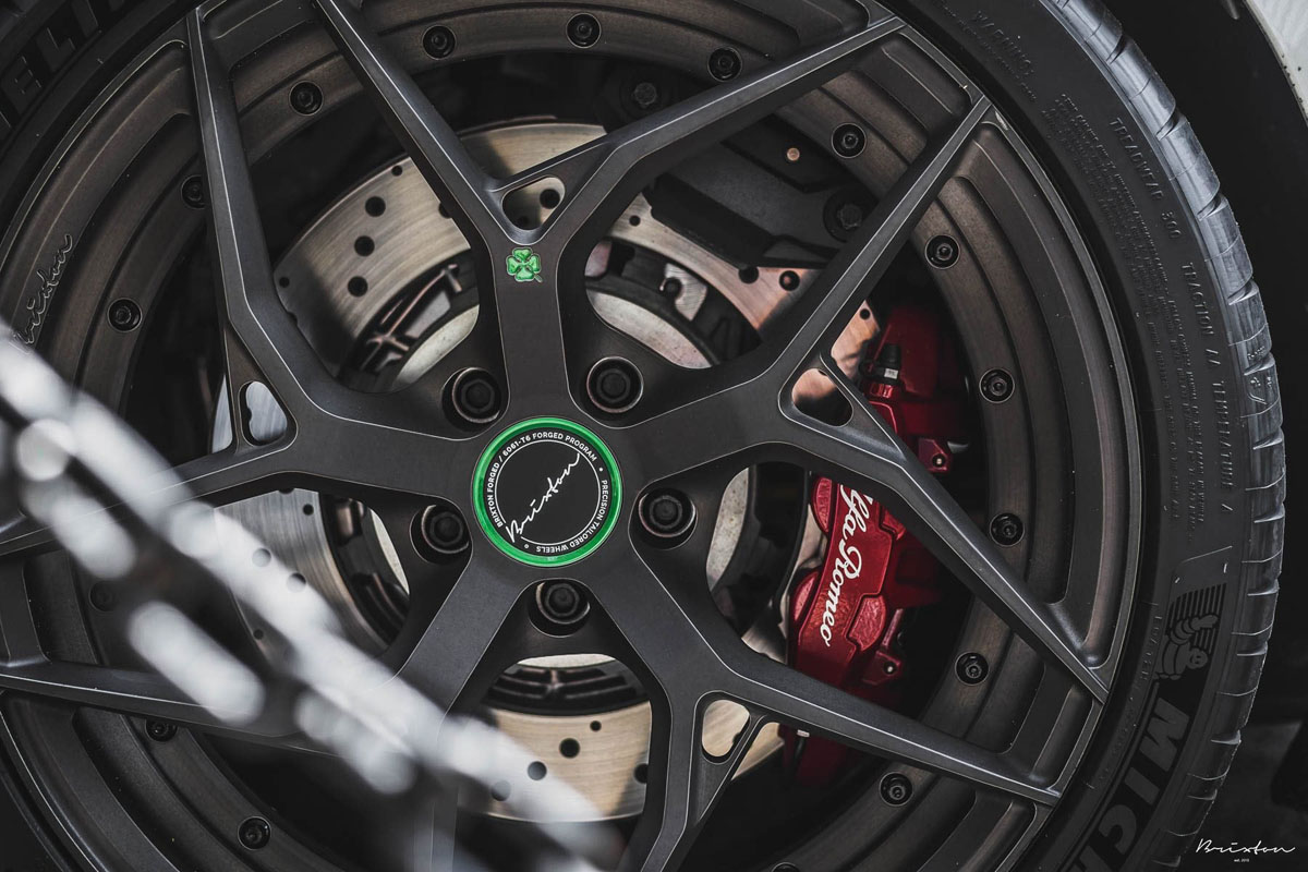 The Alfa Romeo Giulia Quadrifoglio was equipped with the new Brixton Forged PF5 Duo Series wheels in a staggered 19 x 9.0 front and 20 x 10.5 rear setup for an athletic stance. Each one of the two-piece forged alloys boasts a brushed Smoke Black finish that contrasts the Trofeo White exterior while new Alfa Romeo Green can be found on the center cap and the eye-catching four-leaf clover sitting proudly on one of the spokes. Lightweight 50/50 Titanium hardware adds a clean and purposeful finishing touch to make this fitment even more enticing.